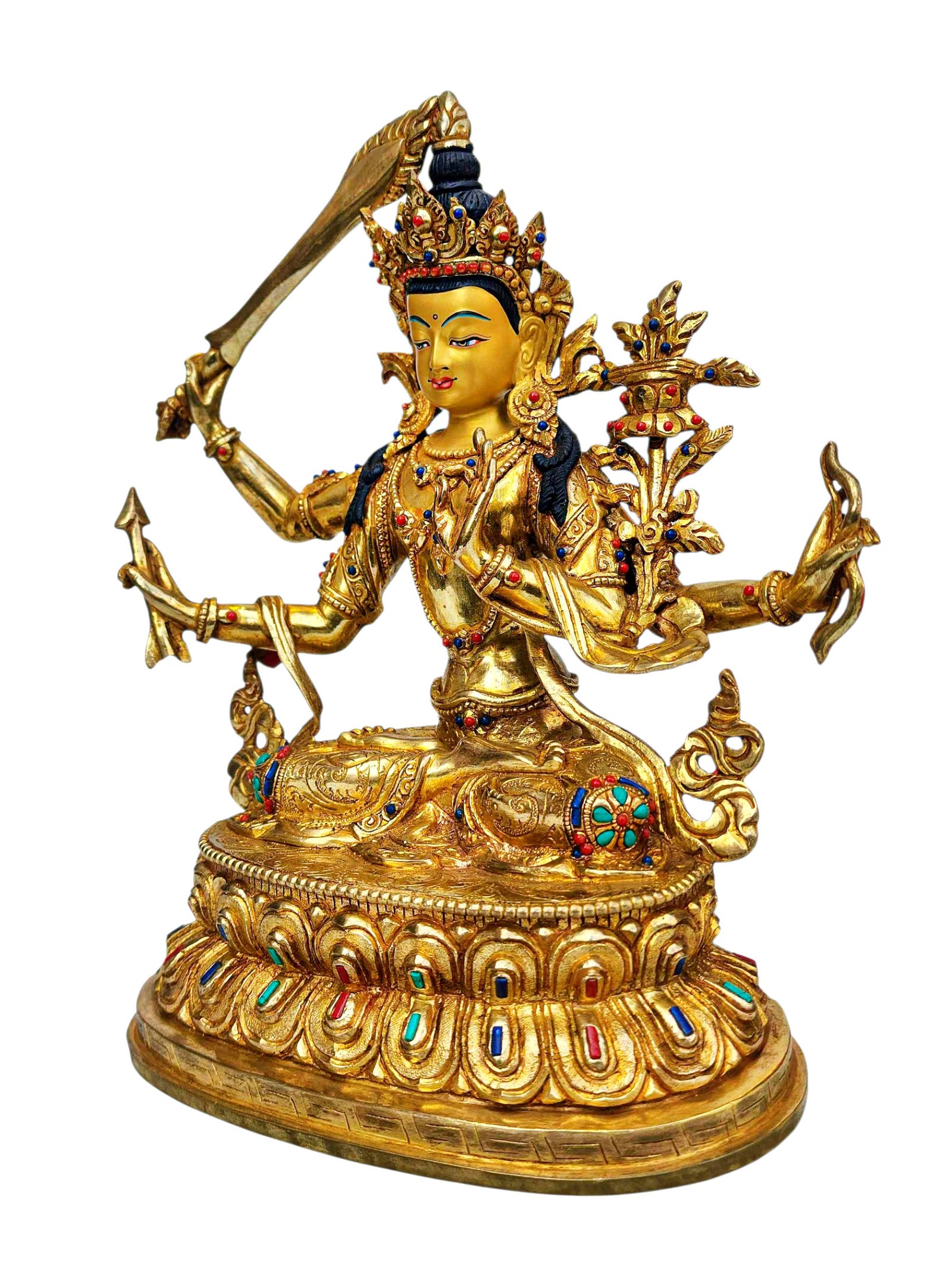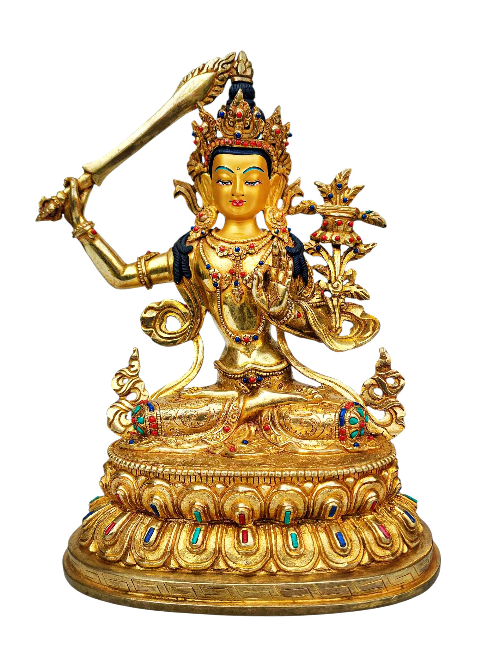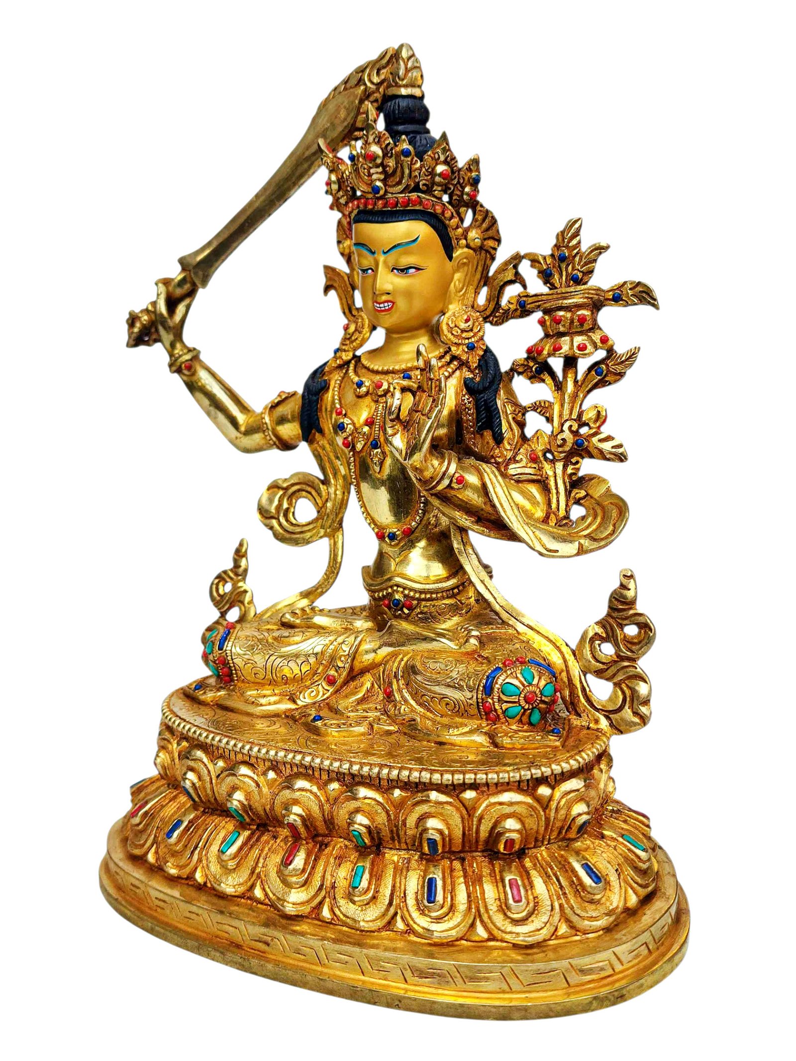 Five Dhyani Manjushri Or Manjushri Set, Buddhist Handmade Statue, Full Gold Plated, Stone Setting, Face Painted , Five Wisdom Aspects of Manjushri, Embodying Supreme Knowledge