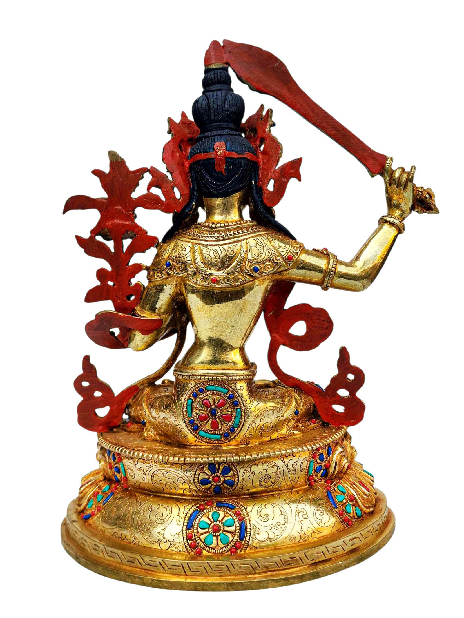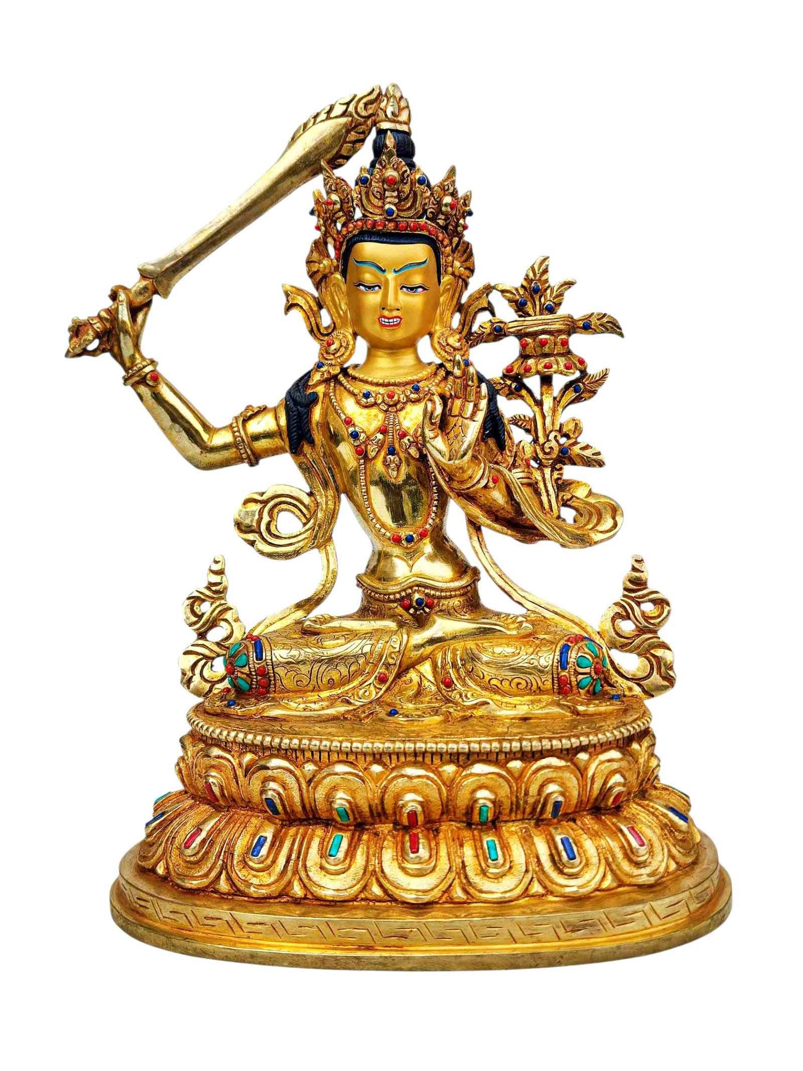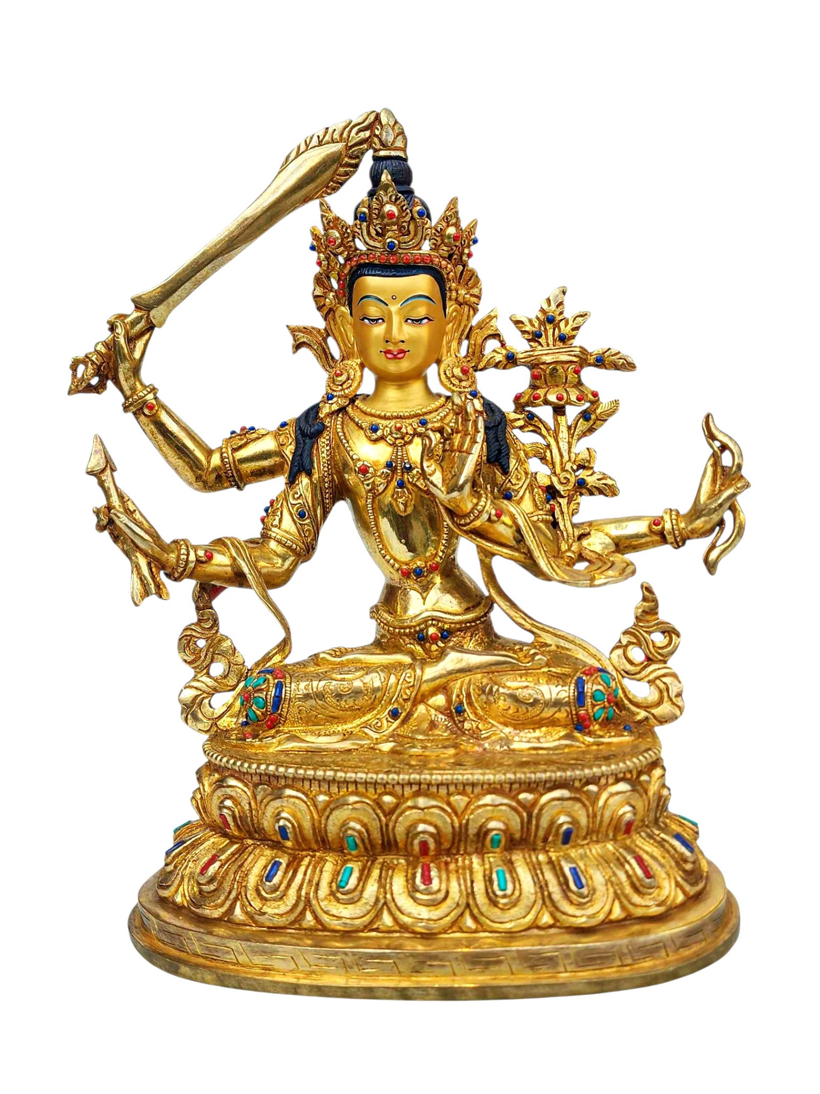 This Five Dhyani Manjushri is finished with full gold plating. also known as mercury gold plating or fire gold plating. This traditional technique involves the application of a genuine layer of gold onto the Five Dhyani Manjushri. Referred to as mercury gold plating, it is considered the correct and authentic form of gold plating in Nepal. Despite being more expensive than electroplating, this traditional mercury gold plating is gaining popularity again in Nepal. People are drawn to its authenticity, longevity, and the unmatched beauty it brings to the Five Dhyani Manjushri. The resurgence of interest in this traditional form of gold plating reflects a growing appreciation for the craftsmanship and cultural heritage of Nepal Read More