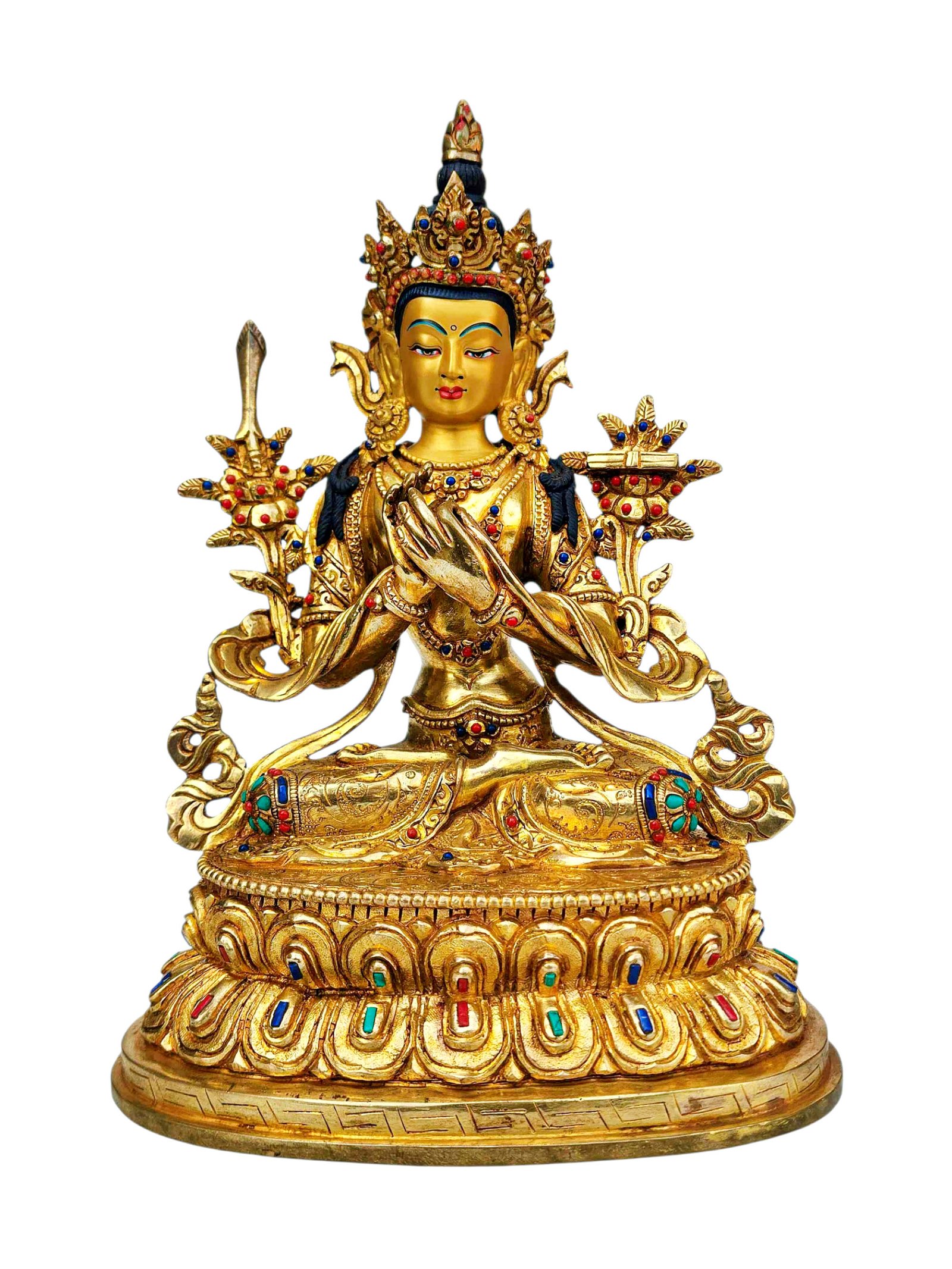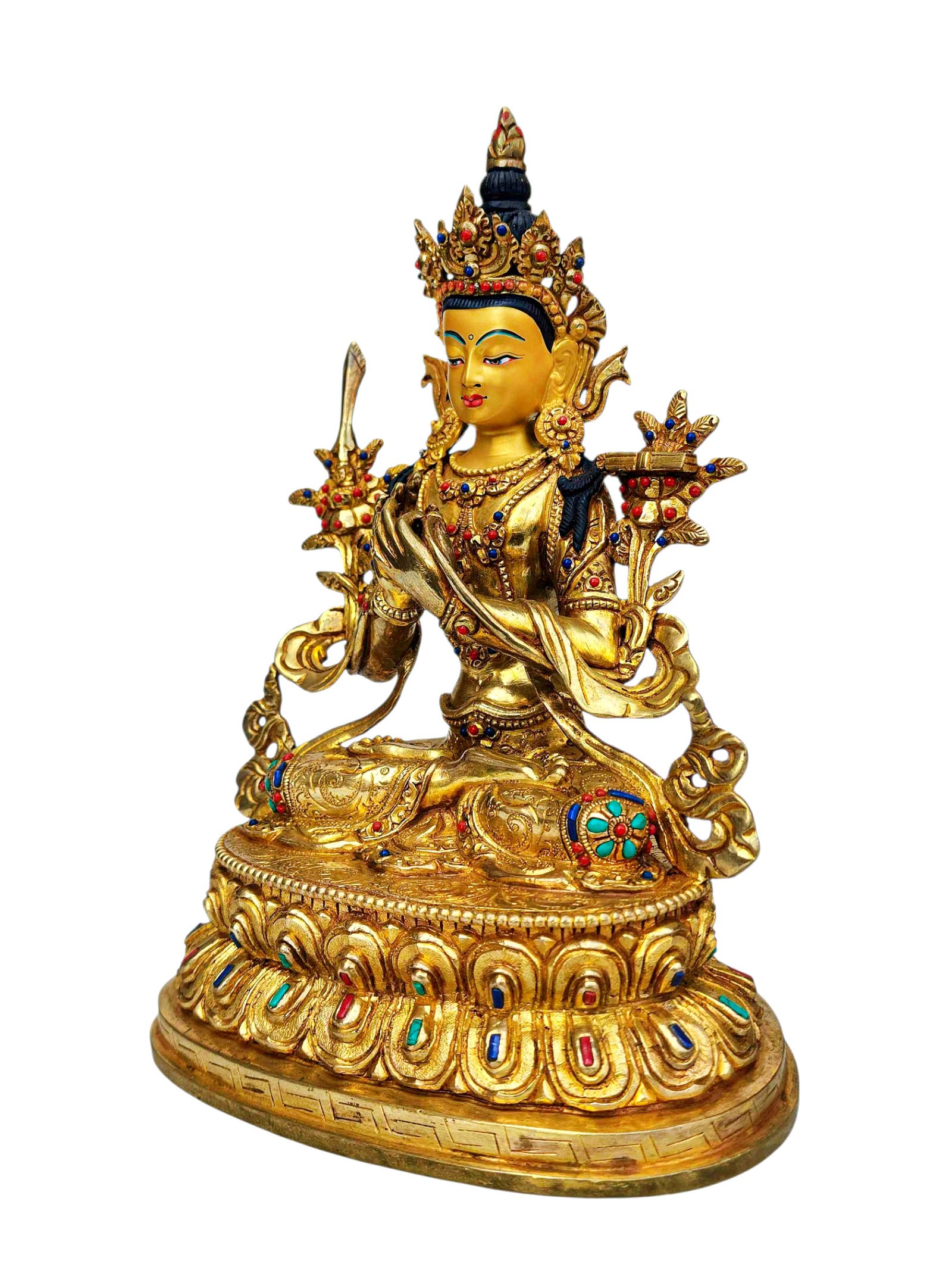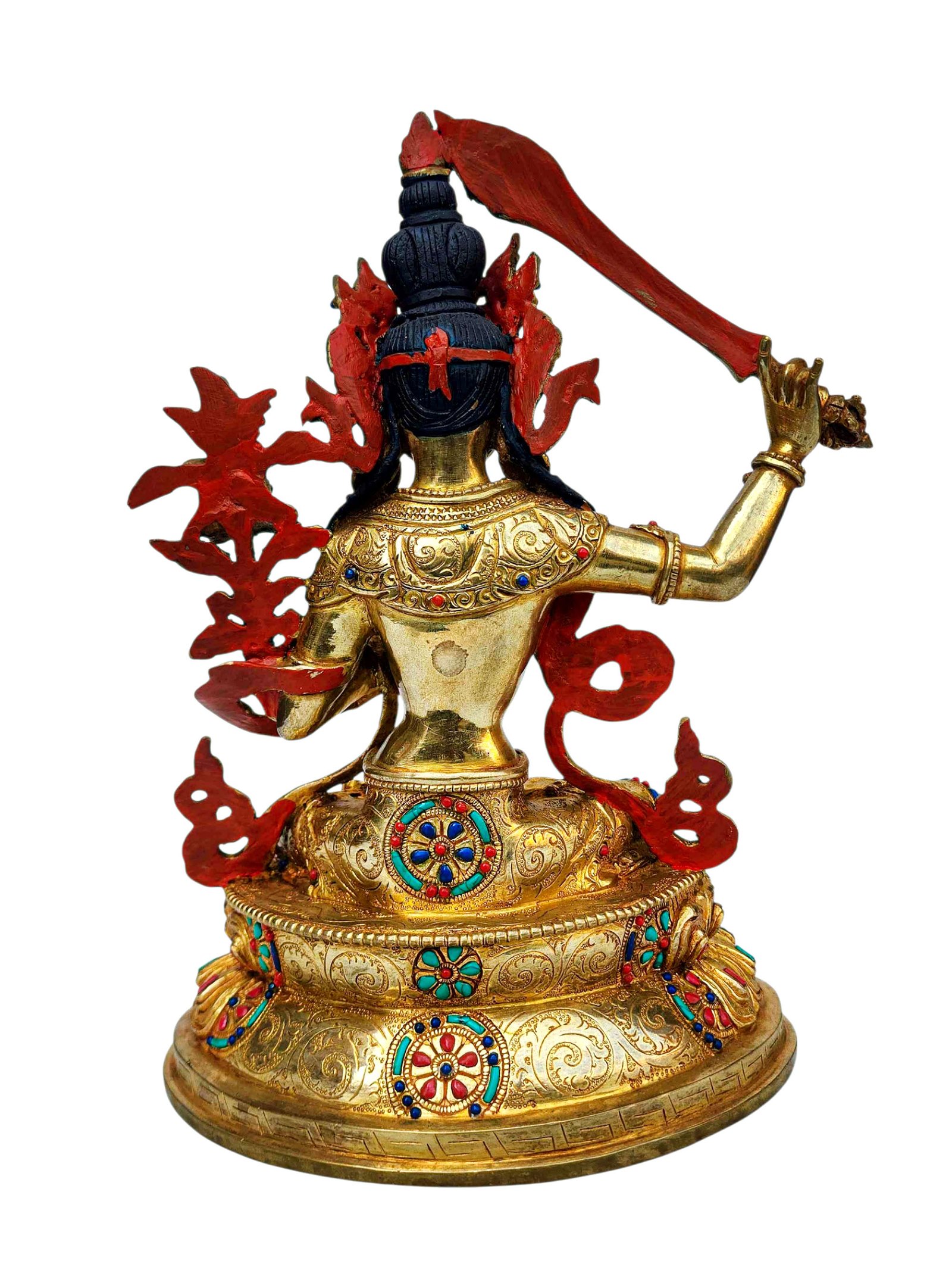 This Five Dhyani Manjushri is finished with full gold plating. also known as mercury gold plating or fire gold plating. This traditional technique involves the application of a genuine layer of gold onto the Five Dhyani Manjushri. Referred to as mercury gold plating, it is considered the correct and authentic form of gold plating in Nepal. Despite being more expensive than electroplating, this traditional mercury gold plating is gaining popularity again in Nepal. People are drawn to its authenticity, longevity, and the unmatched beauty it brings to the Five Dhyani Manjushri. The resurgence of interest in this traditional form of gold plating reflects a growing appreciation for the craftsmanship and cultural heritage of Nepal Read More