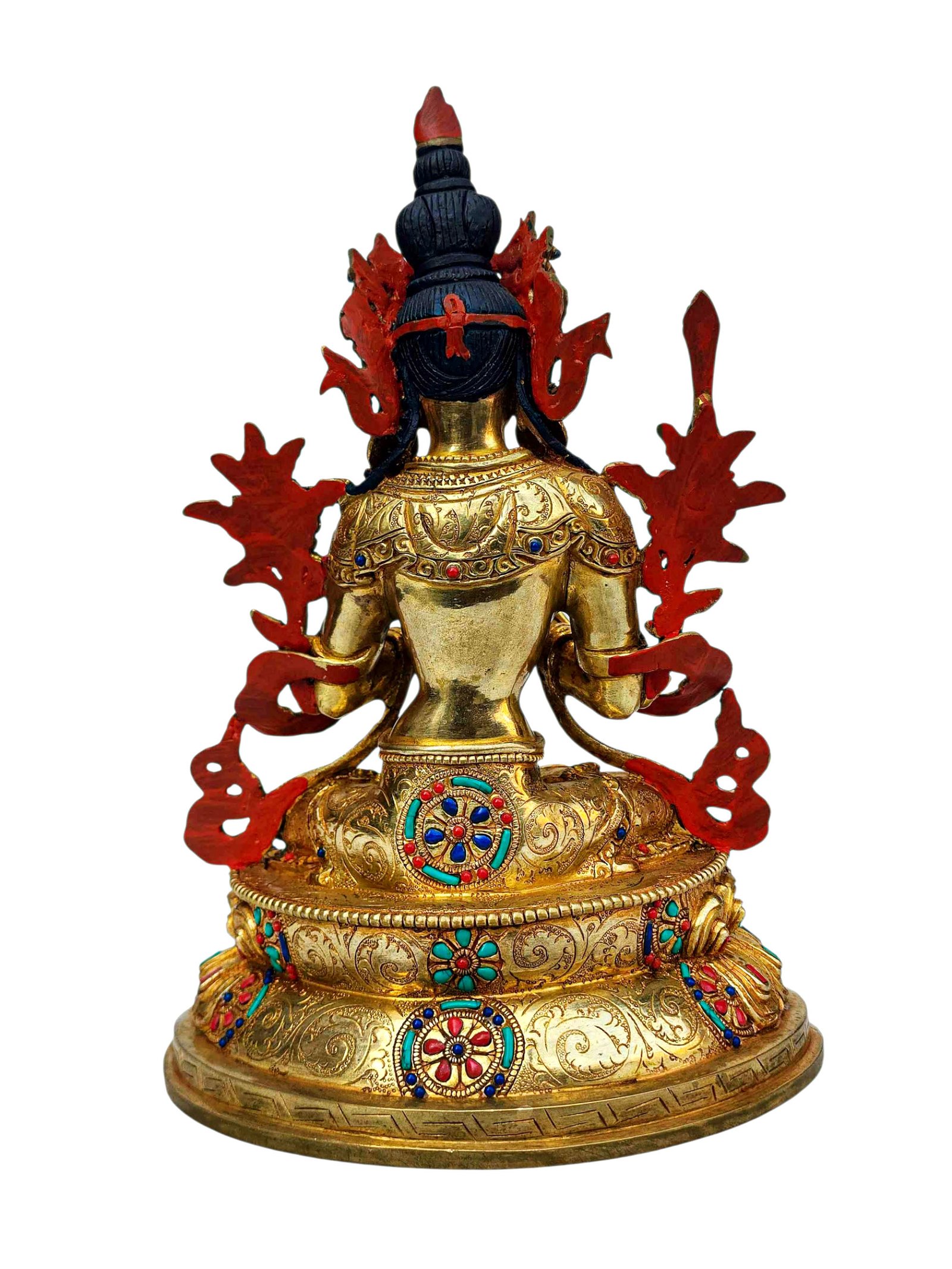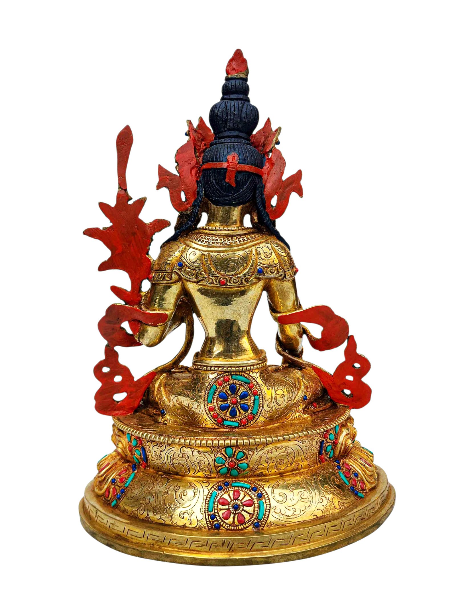 The Five Dhyani Manjushri is adorned with an exquisite array of semi-precious stones, including turquoise, coral, and lapis lazuli. These stones are carefully selected and meticulously placed on the Five Dhyani Manjushri's surface, adding a touch of opulence and enhancing its overall beauty. Each stone is thoughtfully positioned using a high-quality adhesive, ensuring secure and long-lasting attachment. The vibrant colors and unique patterns of the stones create a captivating contrast against the backdrop of the Five Dhyani Manjushri, elevating its visual appeal and making it truly eye-catching. Read More