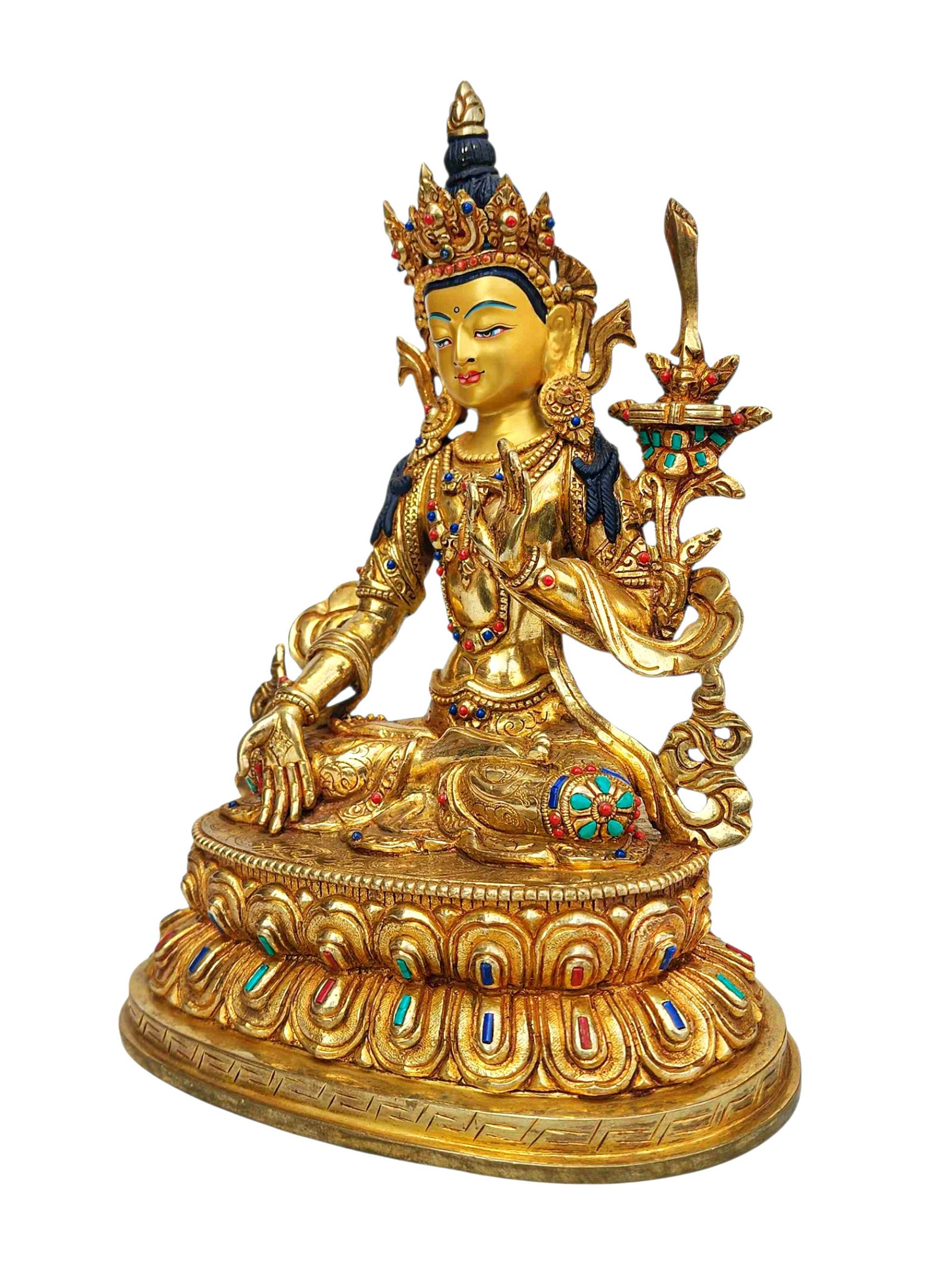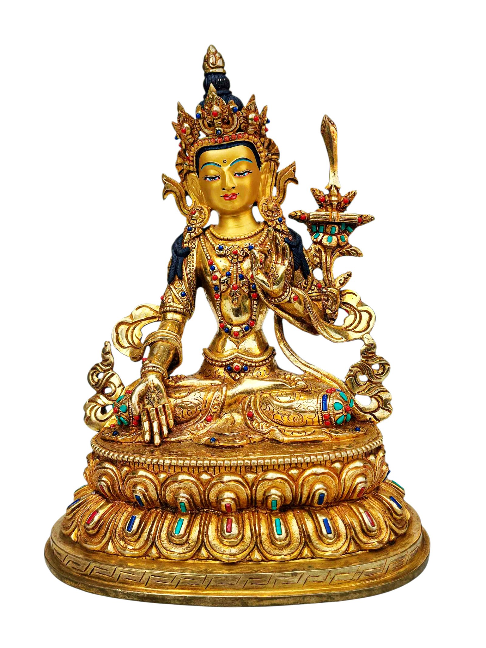 Green Manjushri: This form of Manjushri is associated with peaceful and calm wisdom. Green represents harmony and balance. Green Manjushri is often depicted holding a sword of wisdom in his right hand and a lotus flower in his left hand, symbolizing the blossoming of wisdom.