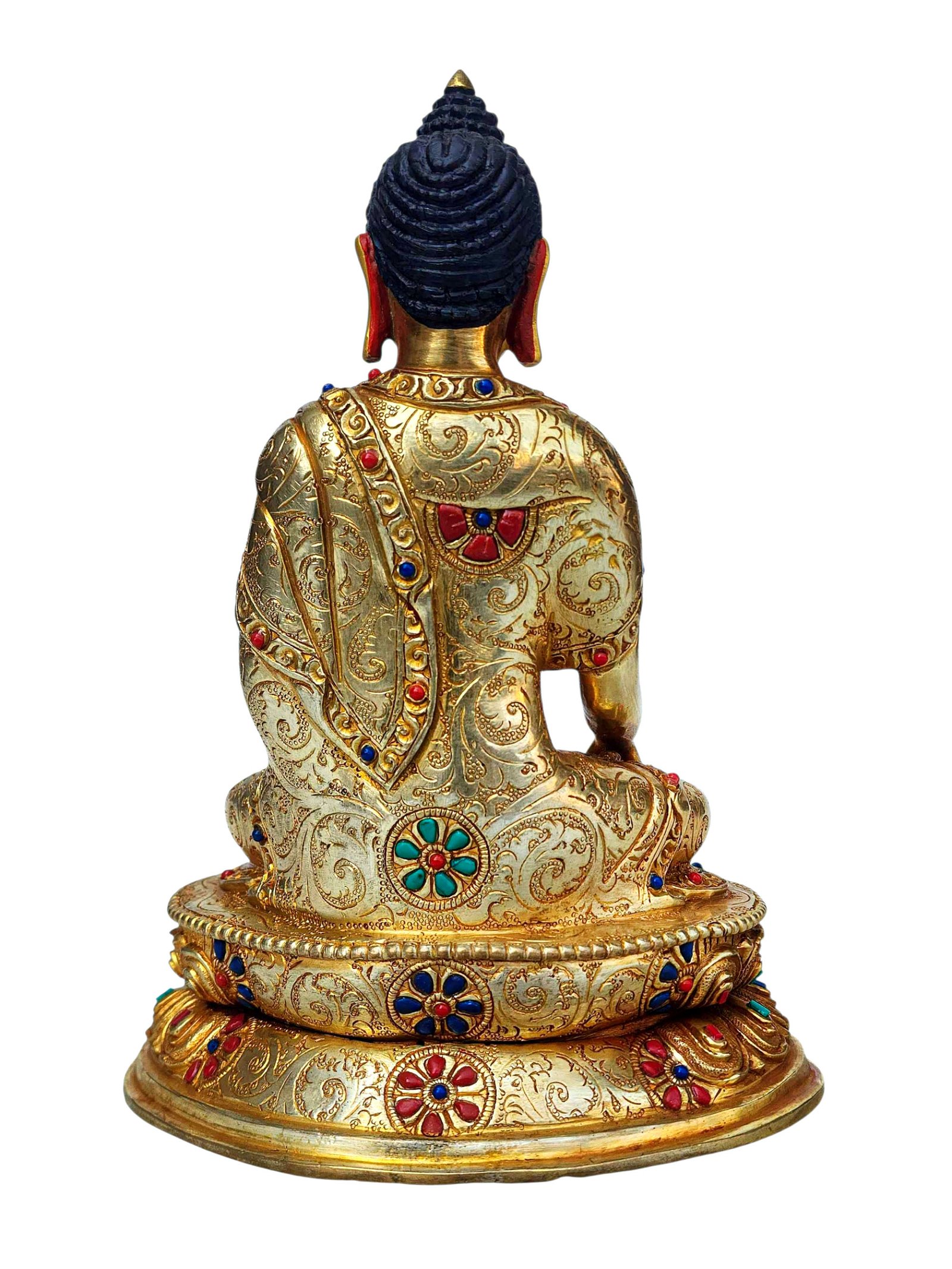 The Shakyamuni Buddha is adorned with an exquisite array of semi-precious stones, including turquoise, coral, and lapis lazuli. These stones are carefully selected and meticulously placed on the Shakyamuni Buddha's surface, adding a touch of opulence and enhancing its overall beauty. Each stone is thoughtfully positioned using a high-quality adhesive, ensuring secure and long-lasting attachment. The vibrant colors and unique patterns of the stones create a captivating contrast against the backdrop of the Shakyamuni Buddha, elevating its visual appeal and making it truly eye-catching. Read More