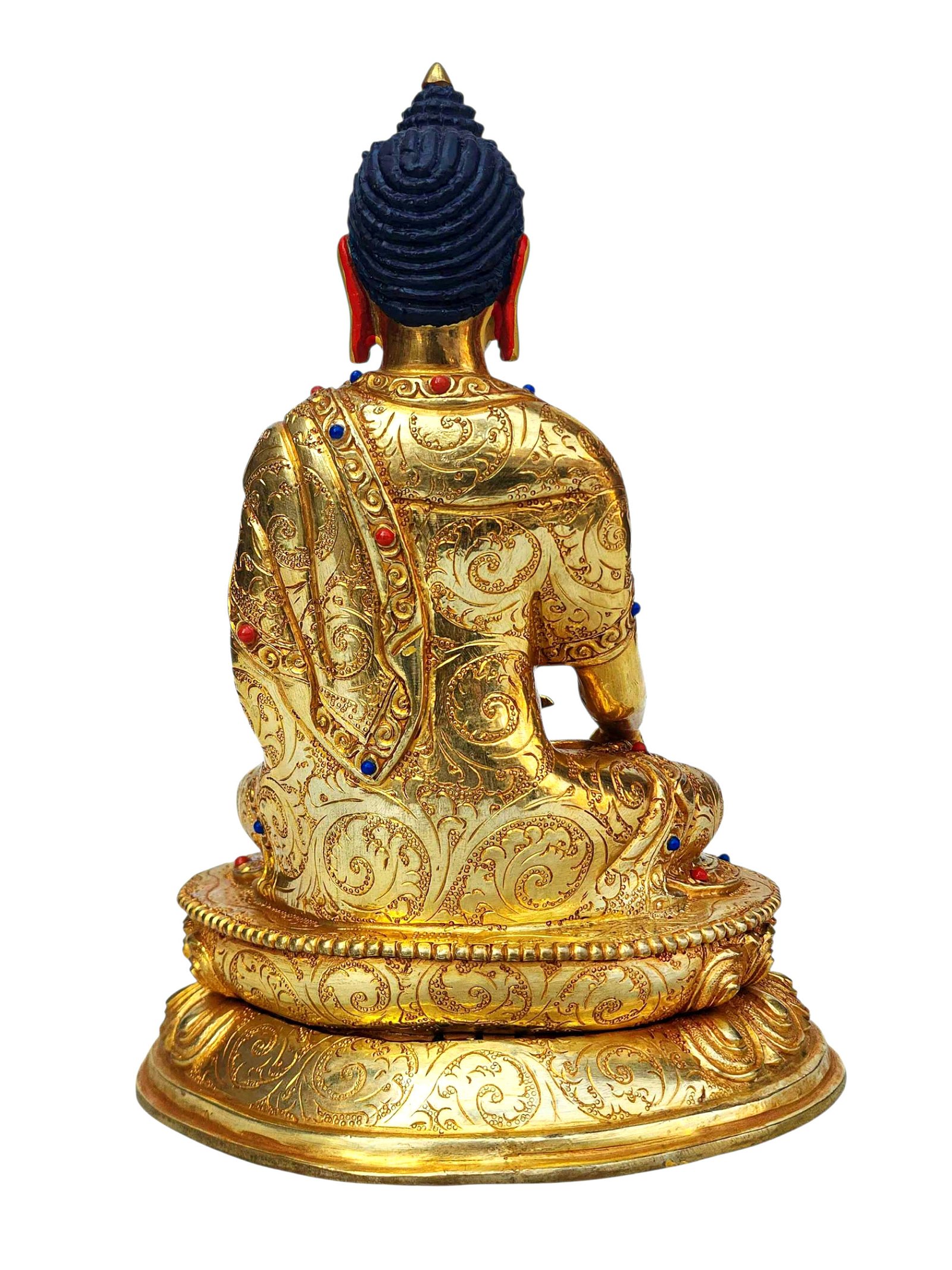 The Shakyamuni Buddha is adorned with an exquisite array of semi-precious stones, including turquoise, coral, and lapis lazuli. These stones are carefully selected and meticulously placed on the Shakyamuni Buddha's surface, adding a touch of opulence and enhancing its overall beauty. Each stone is thoughtfully positioned using a high-quality adhesive, ensuring secure and long-lasting attachment. The vibrant colors and unique patterns of the stones create a captivating contrast against the backdrop of the Shakyamuni Buddha, elevating its visual appeal and making it truly eye-catching. Read More