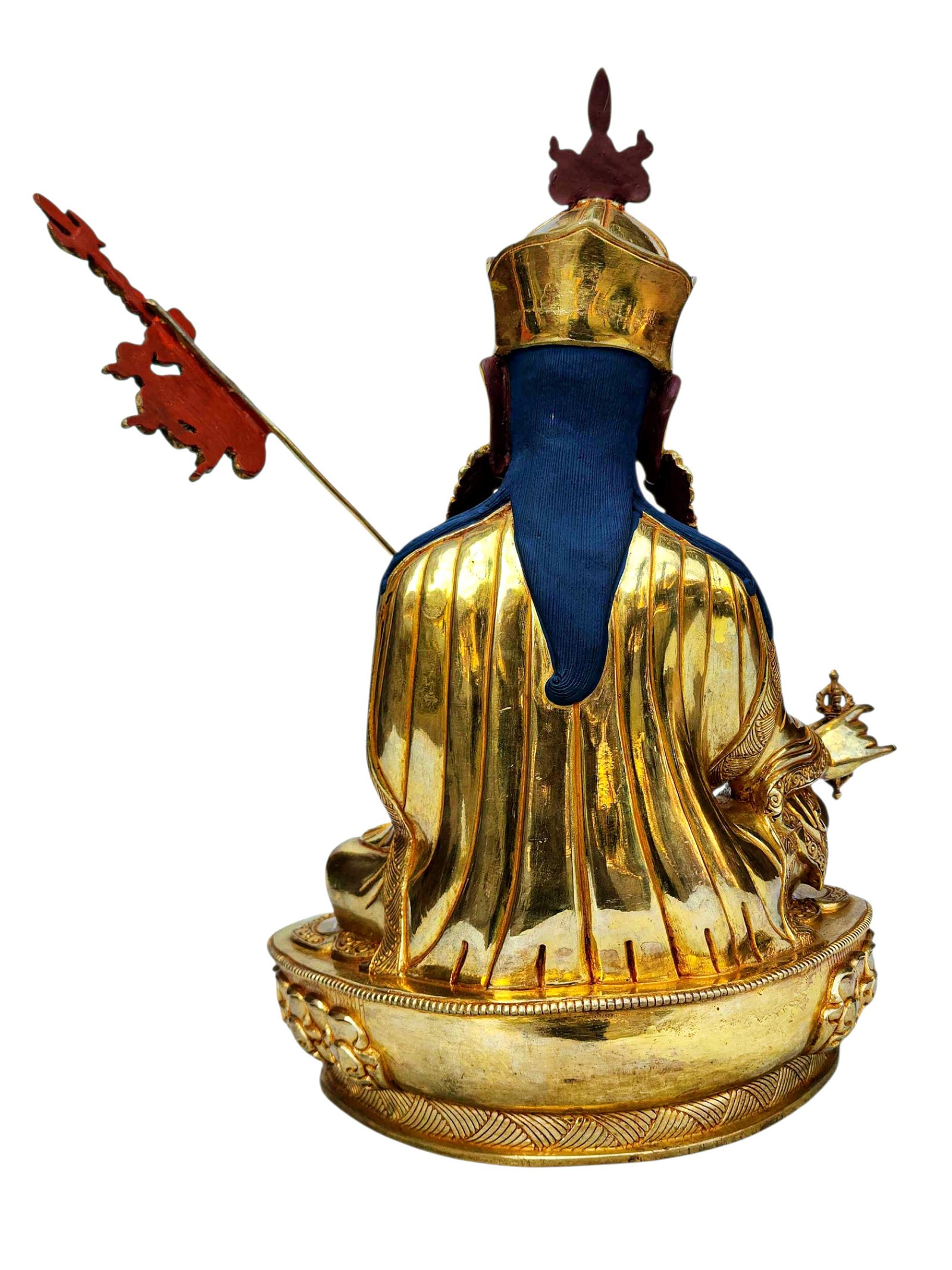 The face of Padmasambhava is painted with gold to enhance its significant features, particularly the eyes, and lips. This detailed painting is essential as it brings forth the crucial attributes of the expression of eyes and lips that metal carving alone cannot capture.