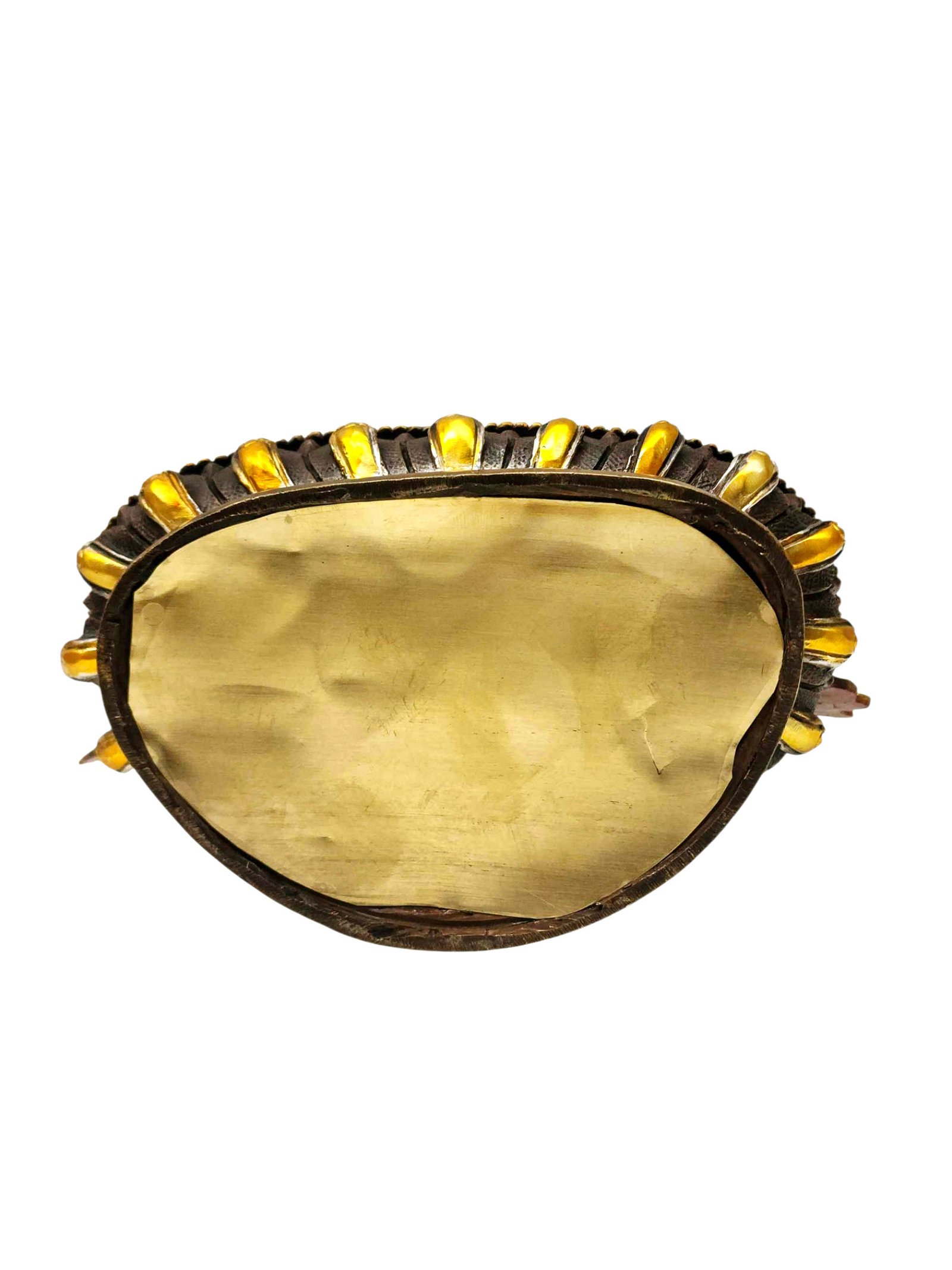 The face of White Tara is painted with gold to enhance its significant features, particularly the eyes, and lips. This detailed painting is essential as it brings forth the crucial attributes of the expression of eyes and lips that metal carving alone cannot capture.