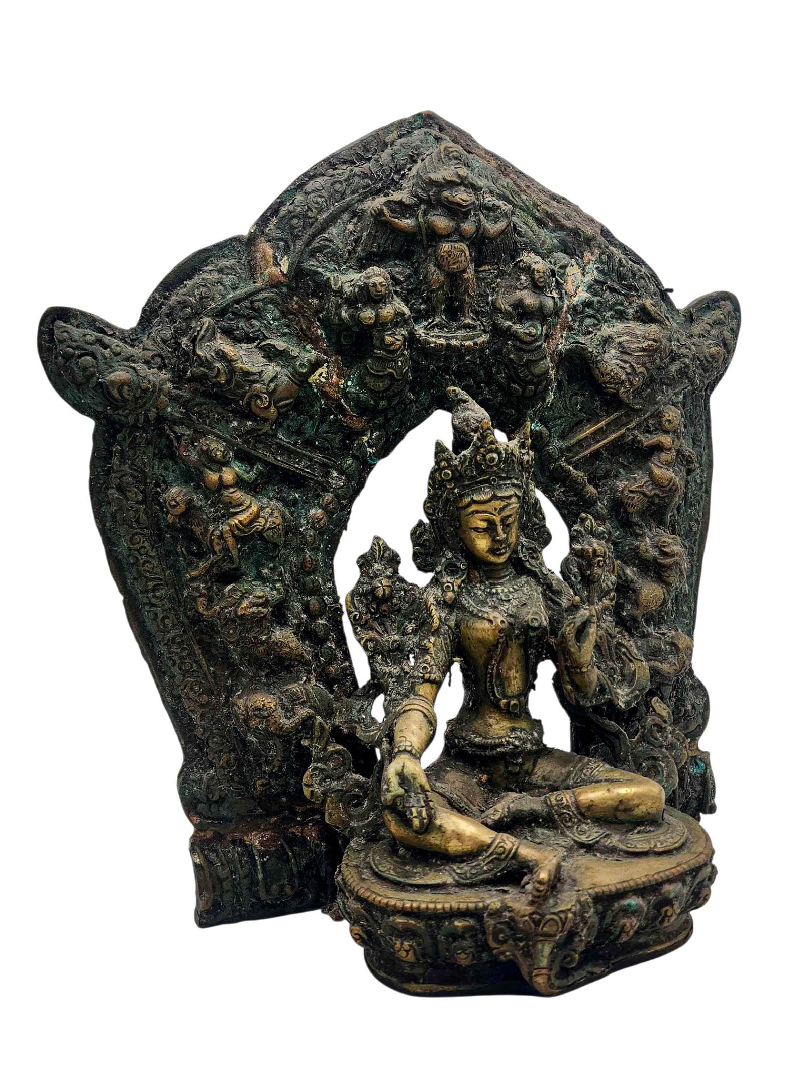 Green Tara with Deities In Background, Handcrafted Buddhist Statue, Antique Finish , Goddess of Compassion, Protection, and Swift Action