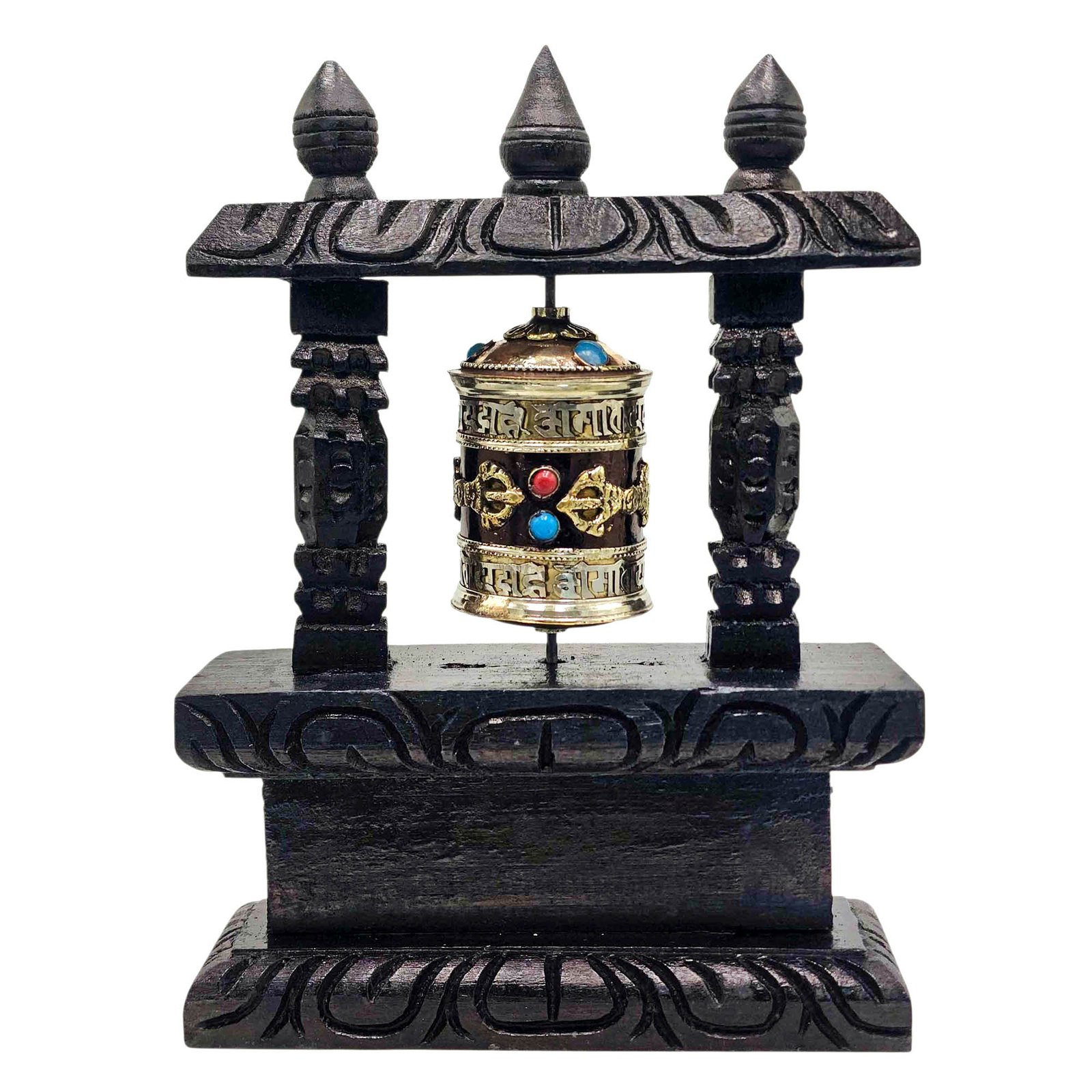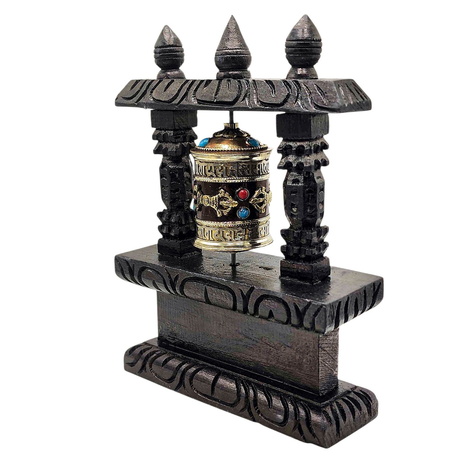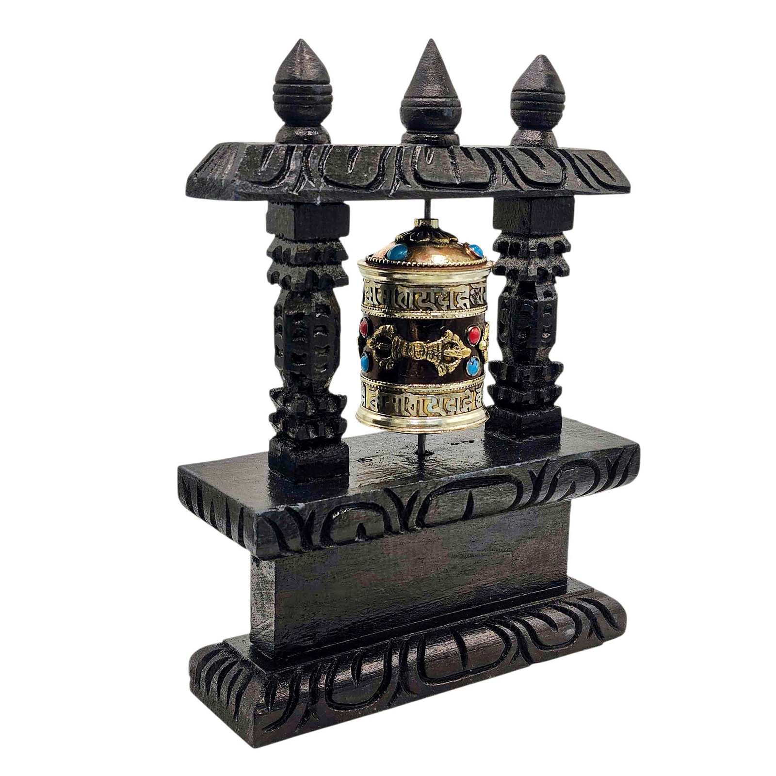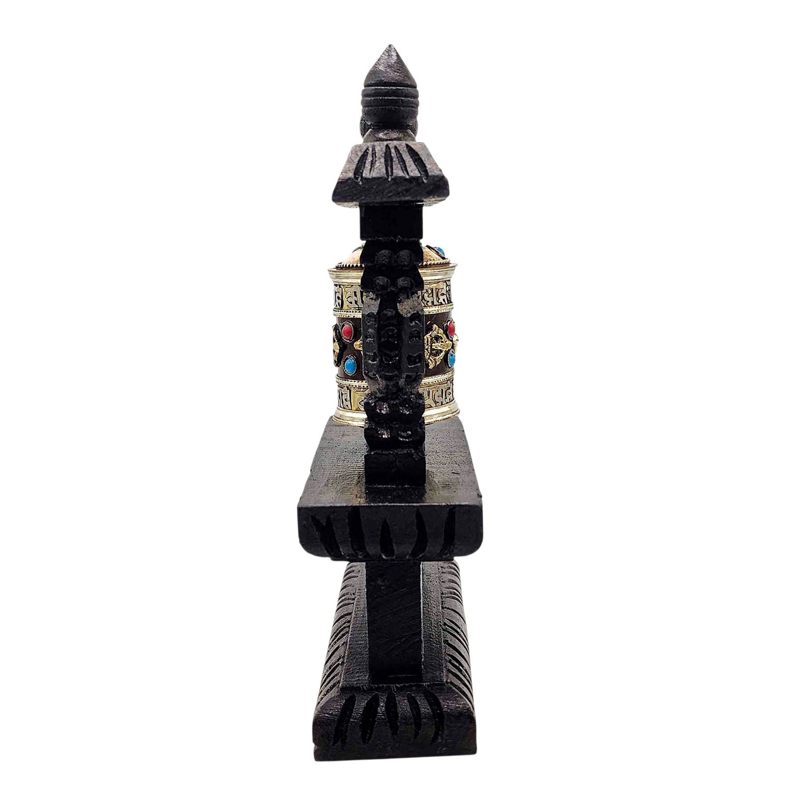 Material and Construction: The prayer wheel stand is typically made from solid wood, such as pine, cedar, or hardwoods like walnut or teak. The choice of wood enhances durability and provides a natural, rustic appearance.
