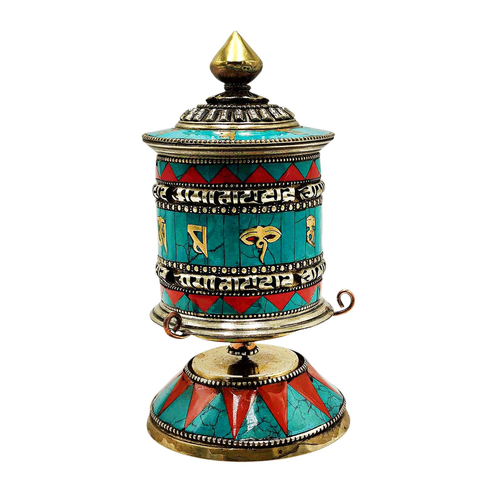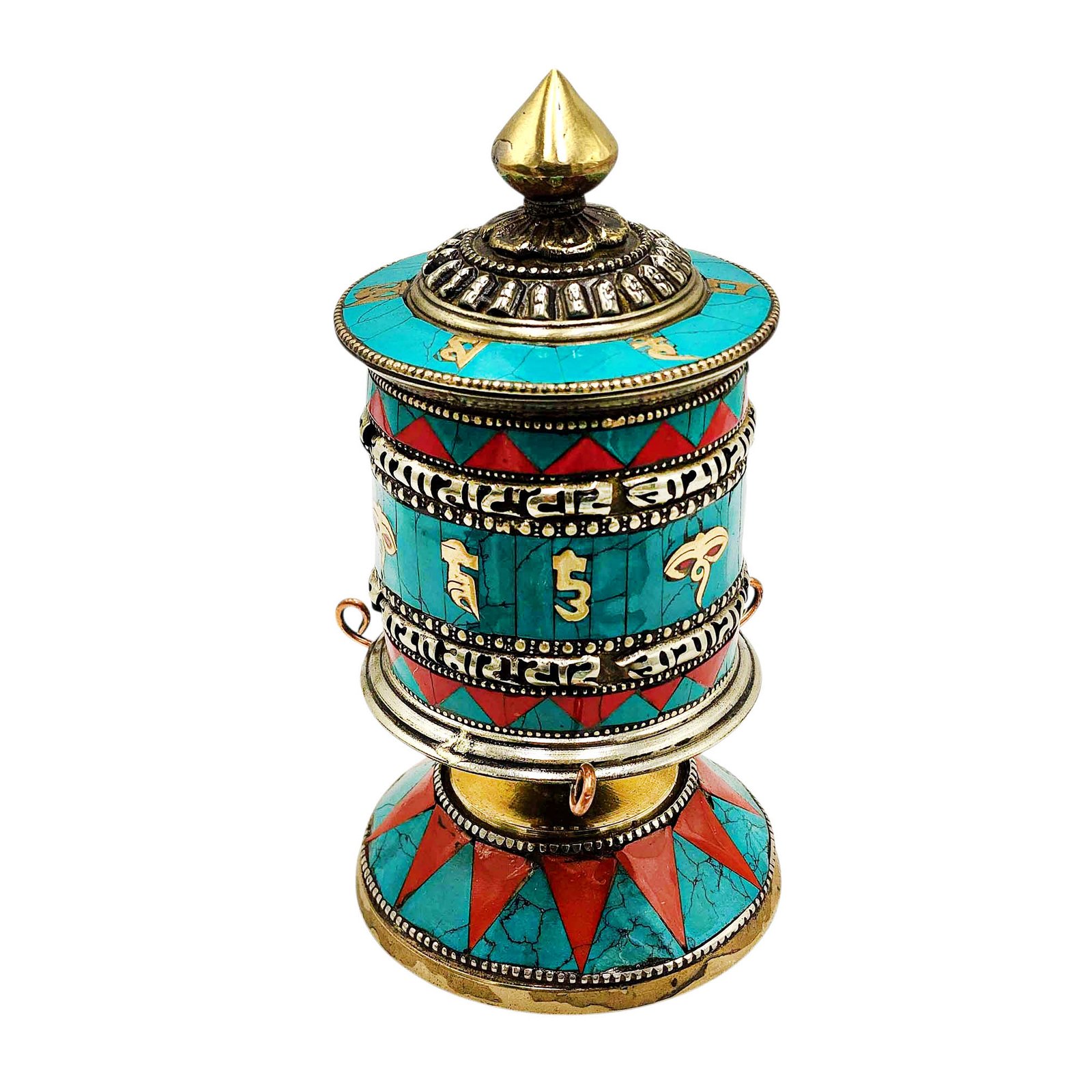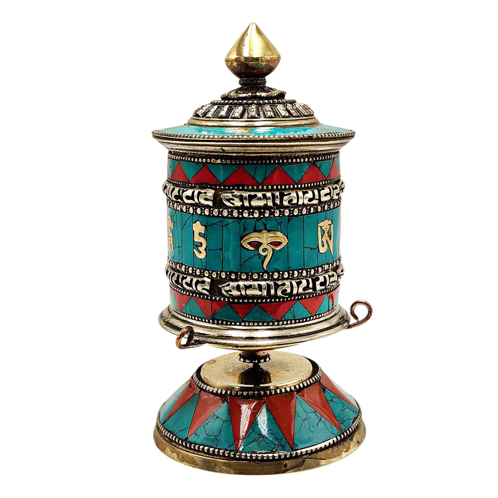 The Prayer wheel Stand is adorned with an exquisite array of semi-precious stones, including turquoise, coral, and lapis lazuli. These stones are carefully selected and meticulously placed on the Prayer wheel Stand's surface, adding a touch of opulence and enhancing its overall beauty. Each stone is thoughtfully positioned using a high-quality adhesive, ensuring secure and long-lasting attachment. The vibrant colors and unique patterns of the stones create a captivating contrast against the backdrop of the Prayer wheel Stand, elevating its visual appeal and making it truly eye-catching. Read More