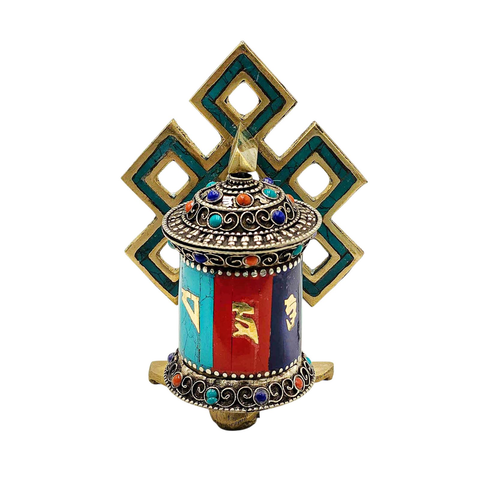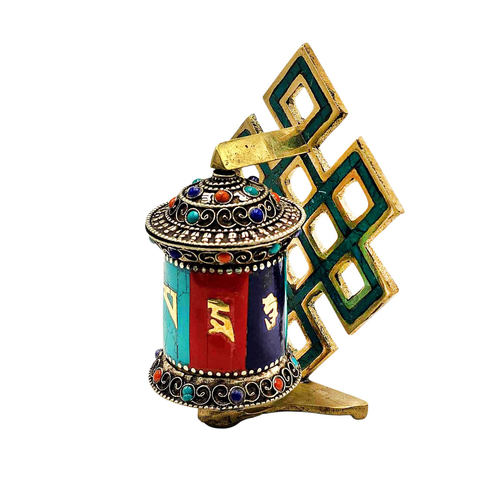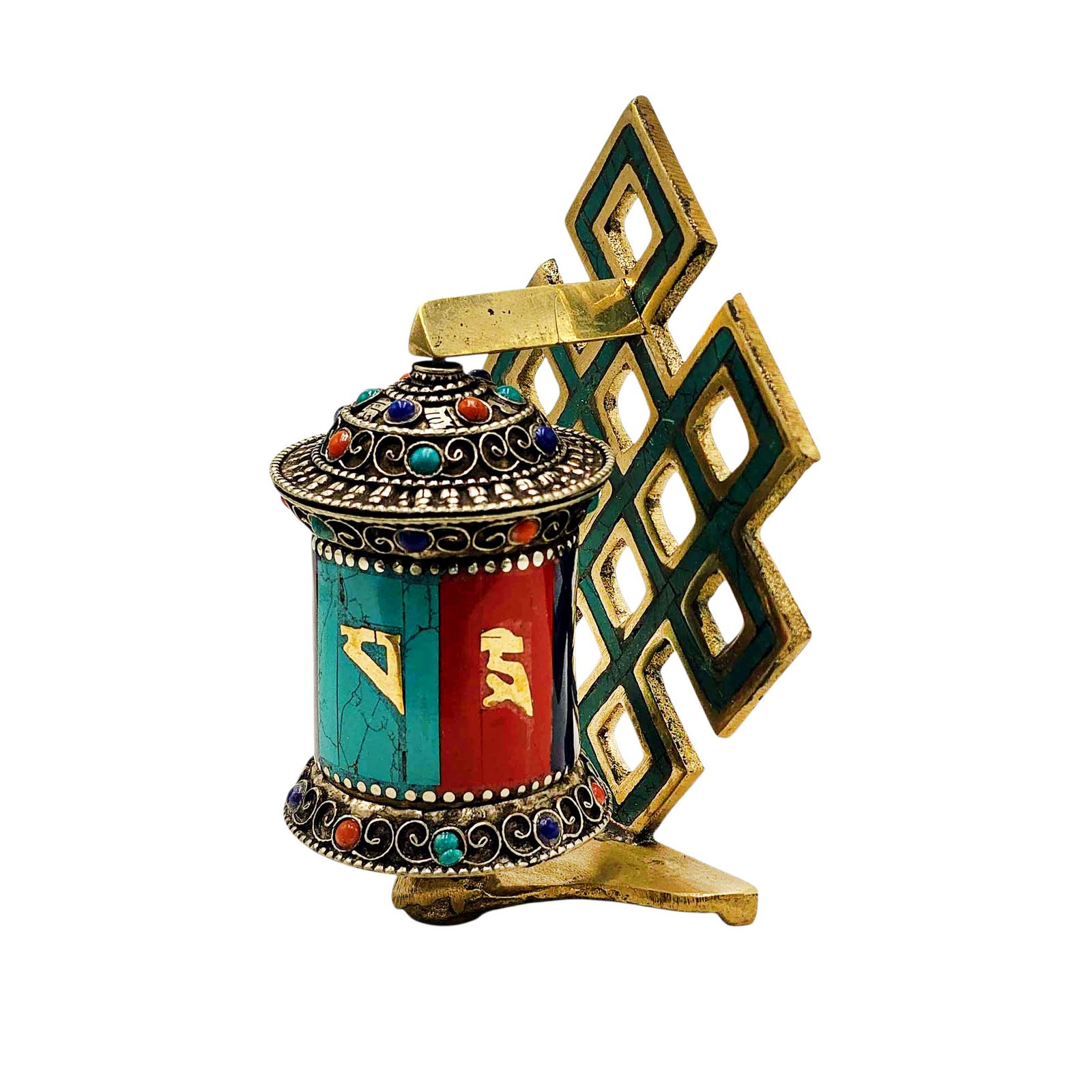 Handcrafted Prayer Wheel, Stone Inlay, Om Mani Padme Hum Mantra, Tabletop Display |