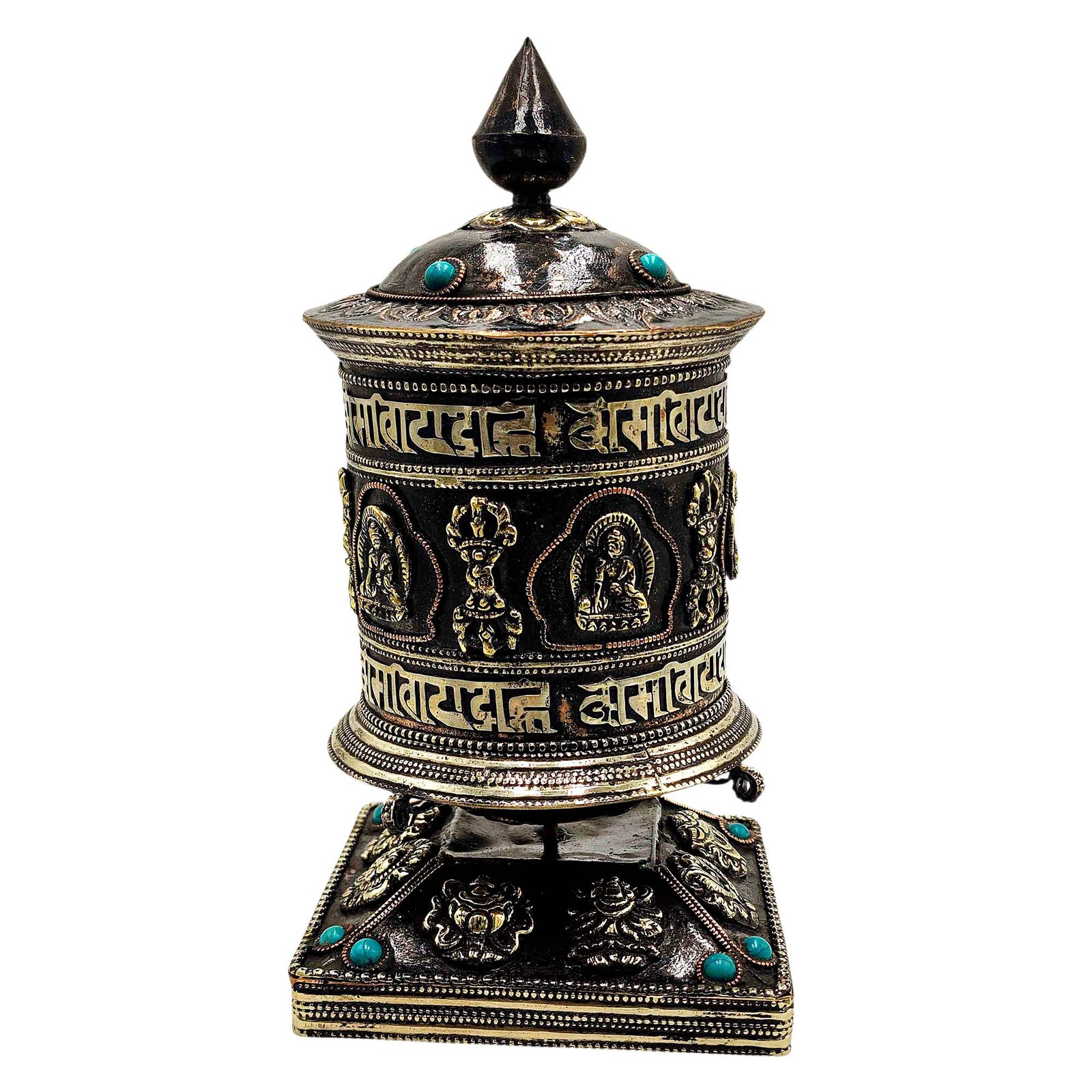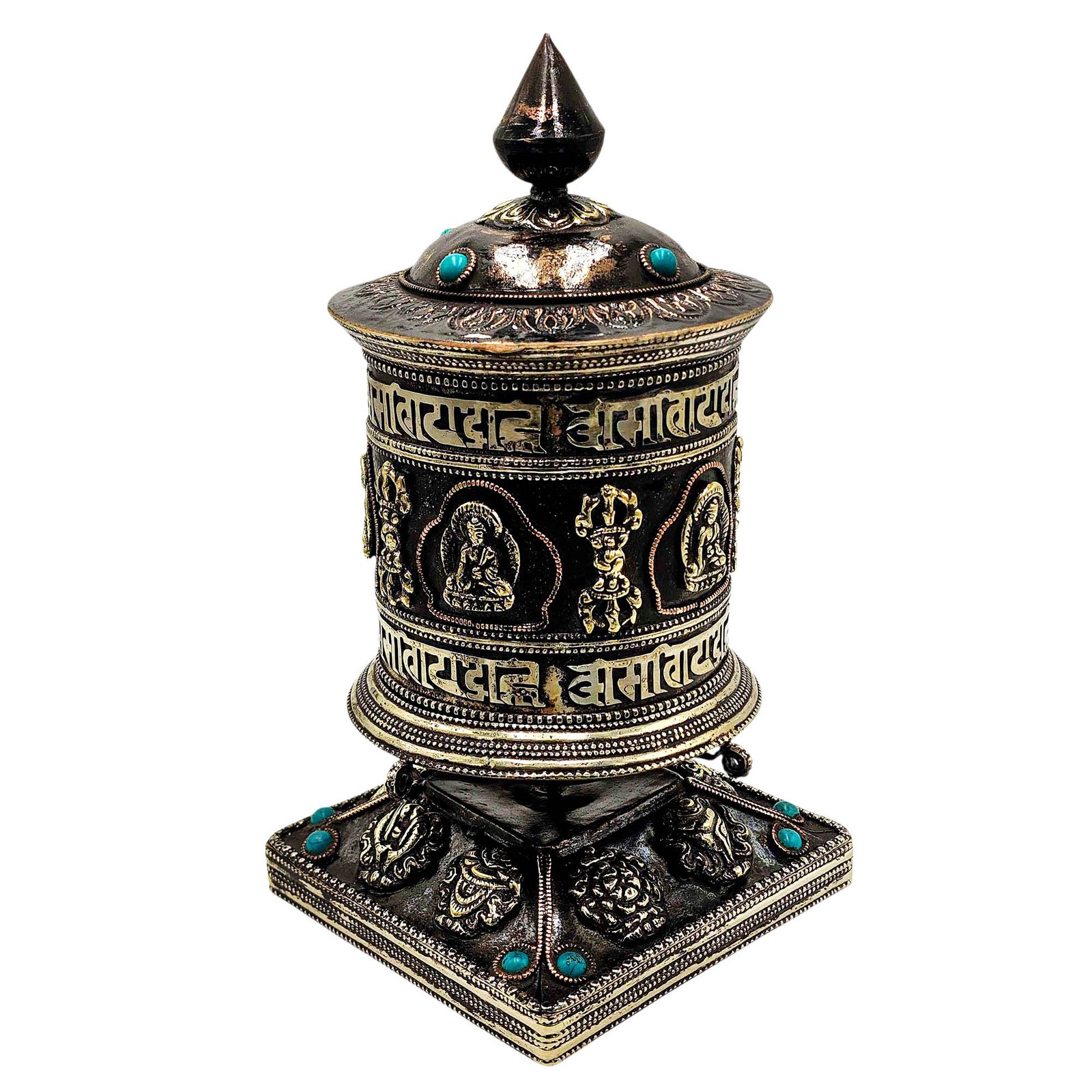 Symbolism and Spiritual Significance: In Tibetan Buddhism, prayer wheels are considered sacred objects that contain written mantras or prayers. Rotating a prayer wheel is believed to accumulate merit and blessings, benefiting both the practitioner and all sentient beings. The prayer wheel stand reinforces the importance of this spiritual practice.