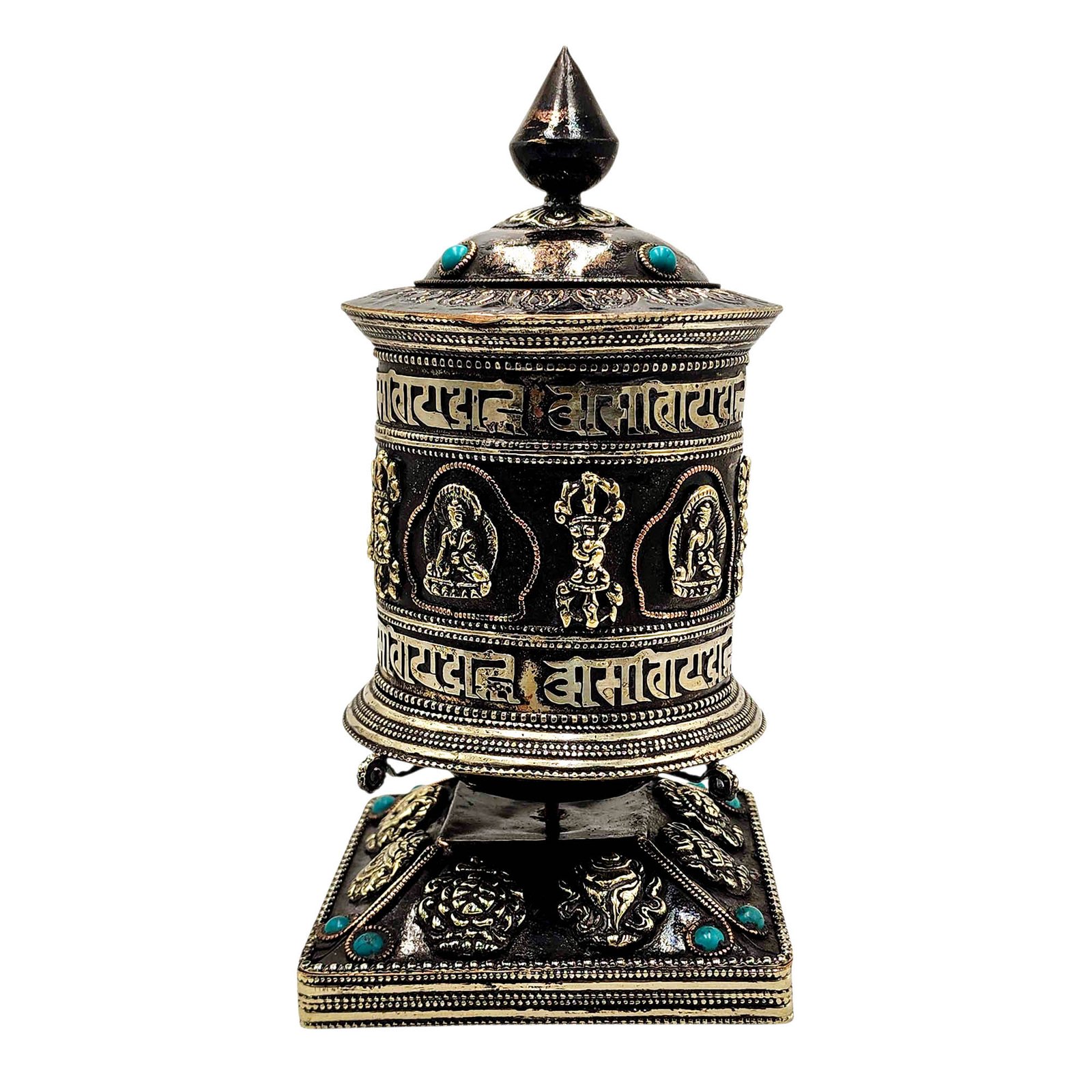 Functionality: The primary function of a prayer wheel stand is to provide a stable base for the prayer wheel, ensuring it remains upright and steady during use. The stand allows the prayer wheel to rotate freely when spun by hand or by the force of wind.