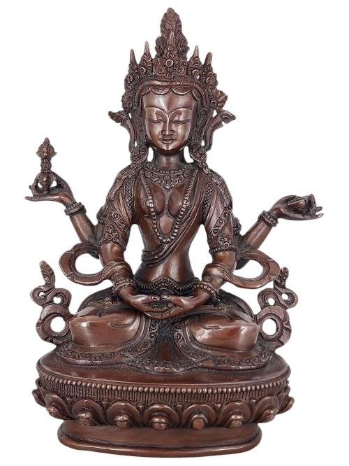 This Prajnaparamita has been meticulously treated with a chocolate color antique patina. The intention behind this patina is to replicate the appearance of a copper statue that has gracefully aged over a century. Unlike a simple coat of paint, this patina is not applied superficially and is designed to endure. It undergoes an artificial oxidation process that adds depth and character, while also serving as a protective layer against natural oxidation.
