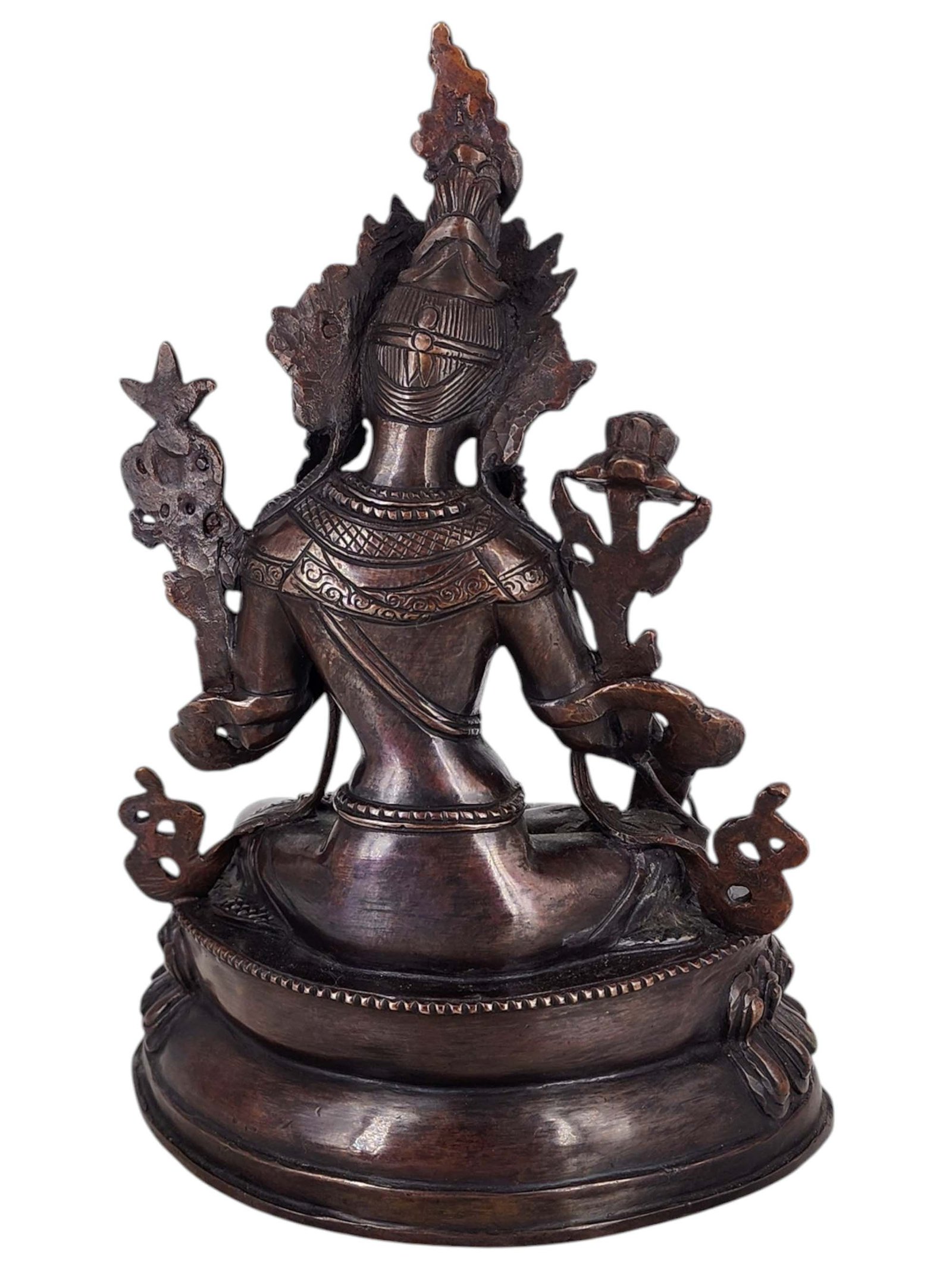This White Tara has been meticulously treated with a chocolate color antique patina. The intention behind this patina is to replicate the appearance of a copper statue that has gracefully aged over a century. Unlike a simple coat of paint, this patina is not applied superficially and is designed to endure. It undergoes an artificial oxidation process that adds depth and character, while also serving as a protective layer against natural oxidation.