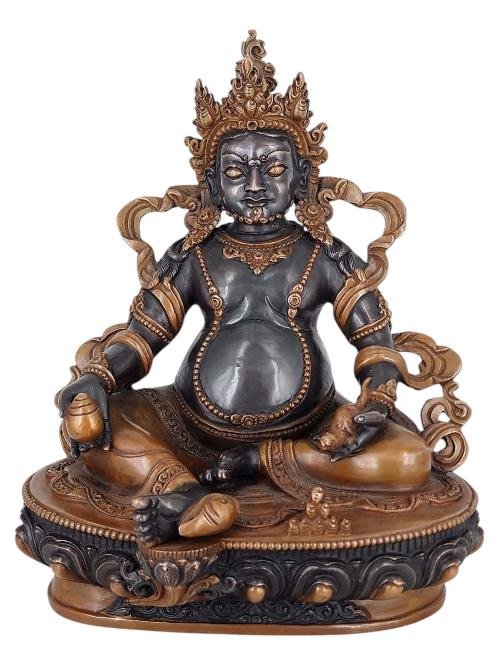 The Yellow Jambhala boasts a mesmerizing double-color oxidation finish, featuring a combination of darker and lighter shades of oxidation. This unique technique adds depth and complexity to the statue's appearance, creating a captivating visual effect. Through a meticulous oxidation process, certain areas of the Yellow Jambhala are intentionally oxidized to achieve a darker shade, while other areas are oxidized to a lighter tone. This deliberate contrast between the two shades creates a dynamic interplay of colors, enhancing the contours and details of the statue. Read More