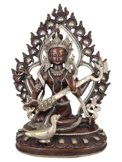 Saraswati Statue Handmade Buddhist Sculpture, Chocolate Oxidized, Silver Plated , Goddess of wisdom, music, and art, inspiring creativity and knowledge