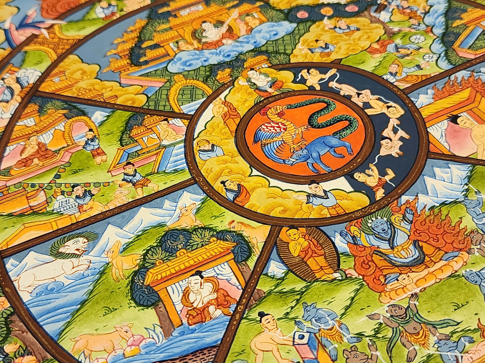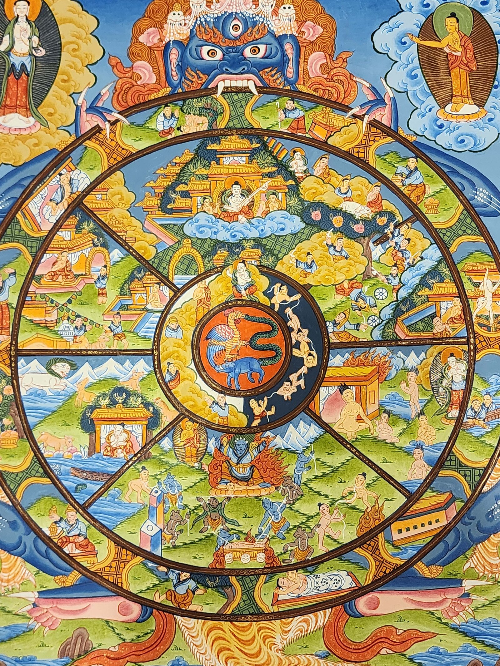 The outer rim of the wheel is divided into twelve sections that represent the Twelve Links of Dependent Origination.