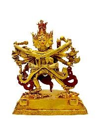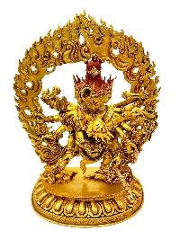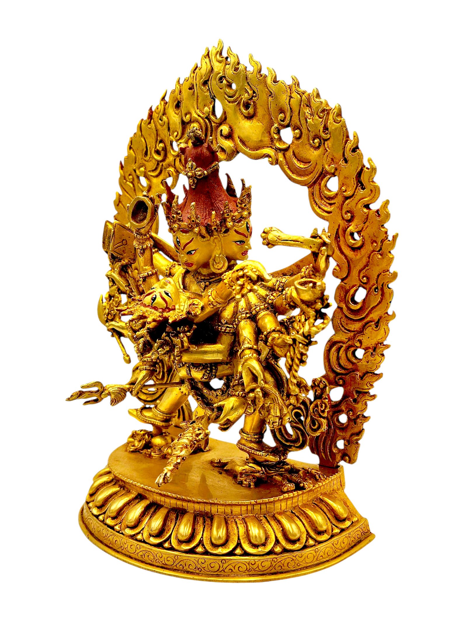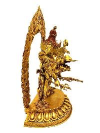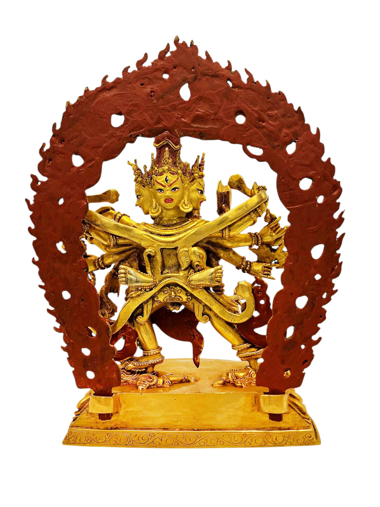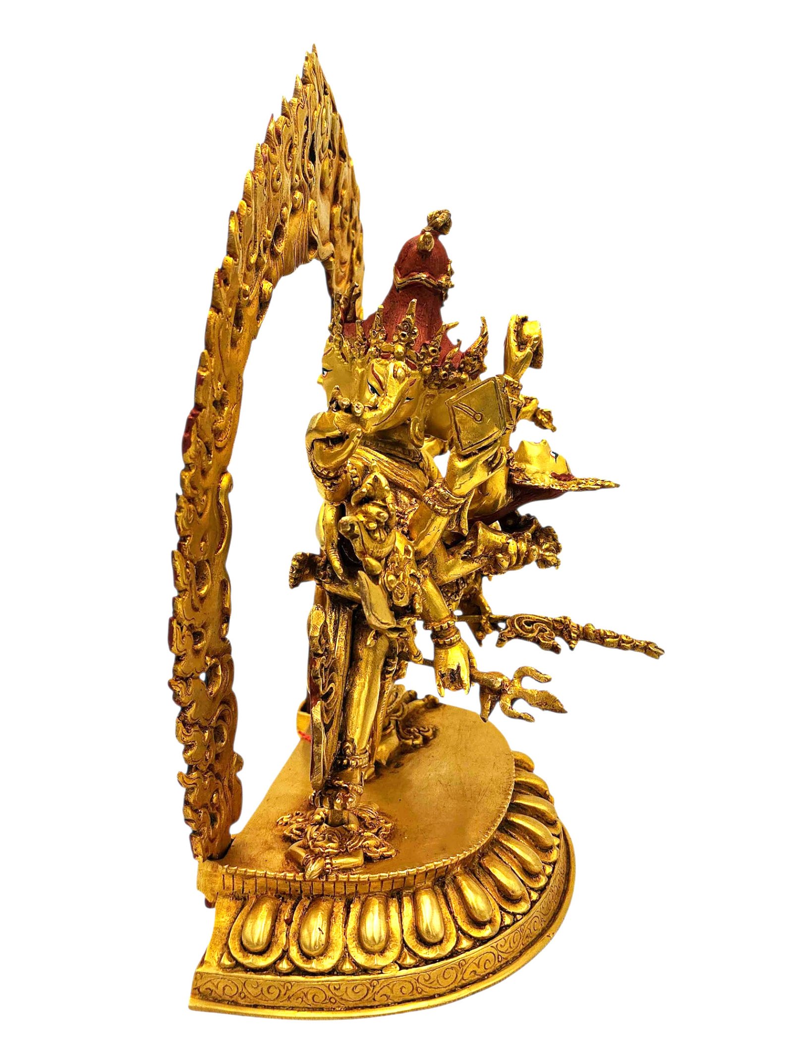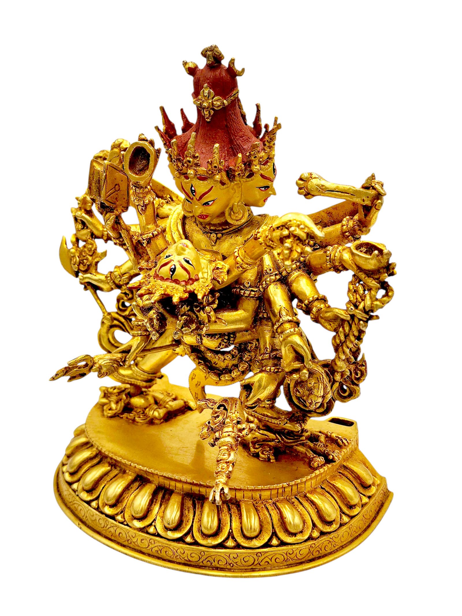 The face of Kalachakra is painted with gold to enhance its significant features, particularly the eyes, and lips. This detailed painting is essential as it brings forth the crucial attributes of the expression of eyes and lips that metal carving alone cannot capture.