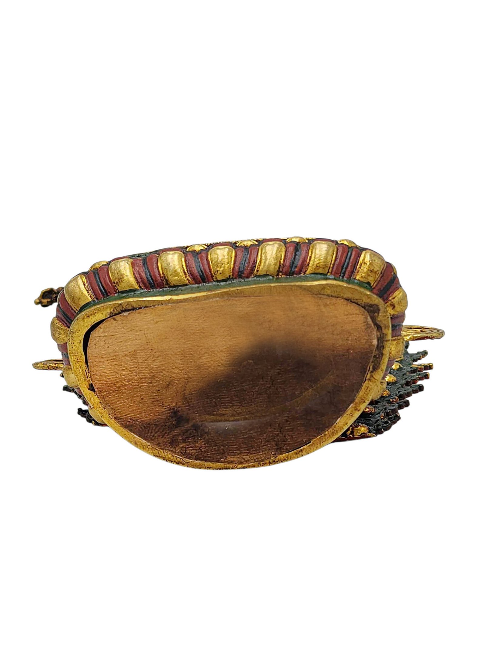 The face of Manjushri is painted with gold to enhance its significant features, particularly the eyes, and lips. This detailed painting is essential as it brings forth the crucial attributes of the expression of eyes and lips that metal carving alone cannot capture.