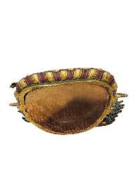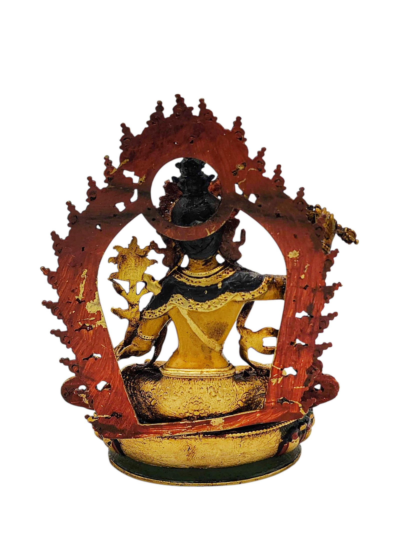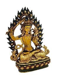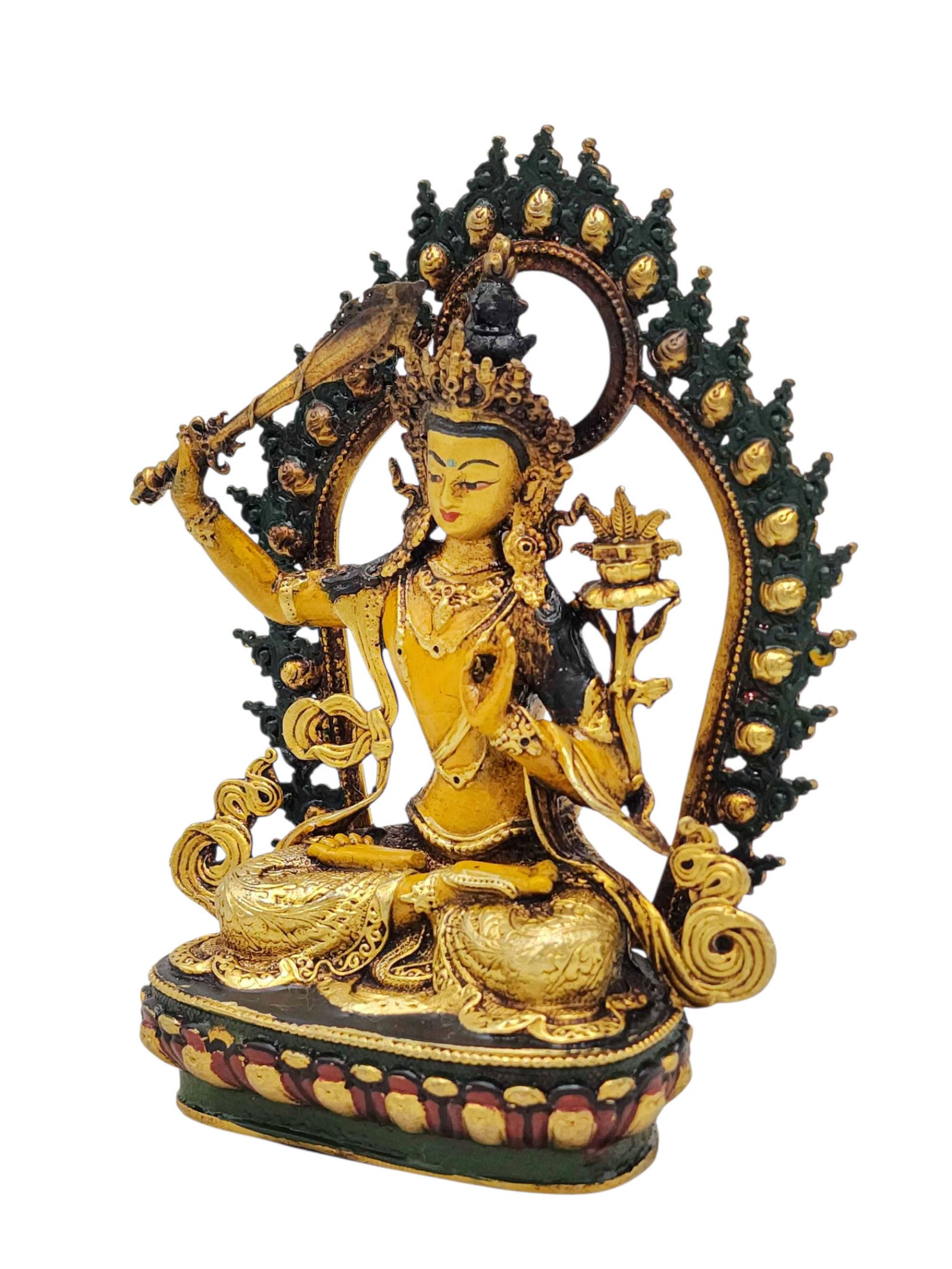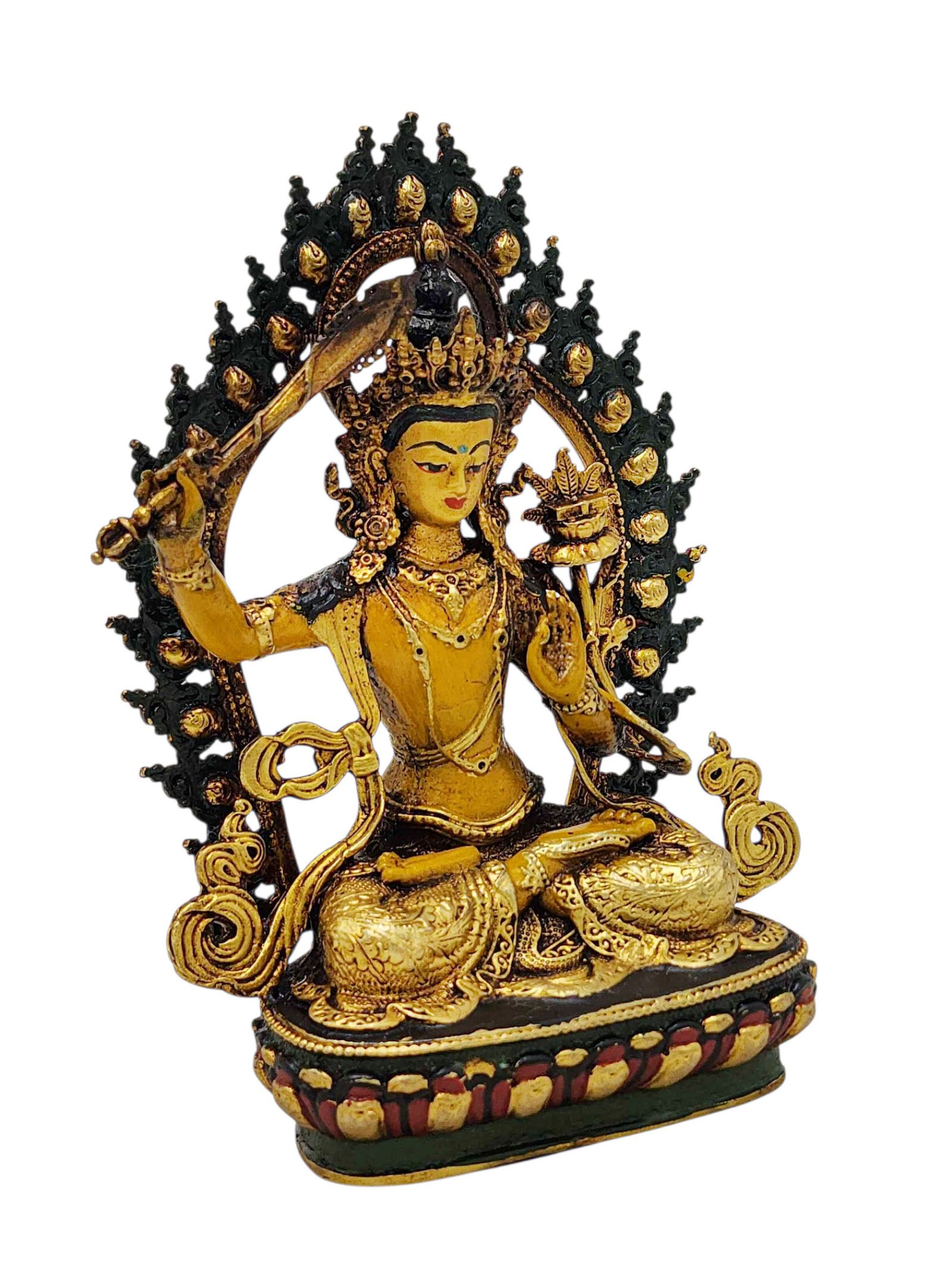 This Manjushri has a Partly gold-plated finish. Partly fire gold gilding, a common practice in Nepali handicrafts. This technique is skillfully employed by artisans to create intricate designs on various metal objects, including statues, jewelry, and decorative items. Through a process, a mask or resist is applied to safeguard specific areas from the gold plating. The object is then subjected to high temperatures, allowing the gold to beautifully adhere to exposed surfaces using a combination of heat and pressure.
