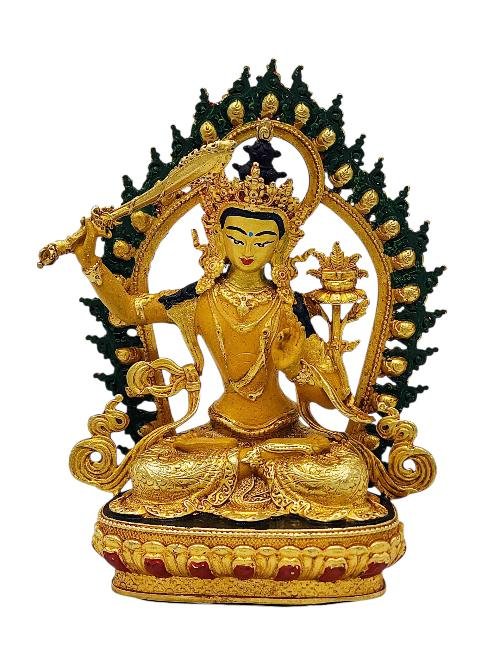This Manjushri has a Partly gold-plated finish. Partly fire gold gilding, a common practice in Nepali handicrafts. This technique is skillfully employed by artisans to create intricate designs on various metal objects, including statues, jewelry, and decorative items. Through a process, a mask or resist is applied to safeguard specific areas from the gold plating. The object is then subjected to high temperatures, allowing the gold to beautifully adhere to exposed surfaces using a combination of heat and pressure.