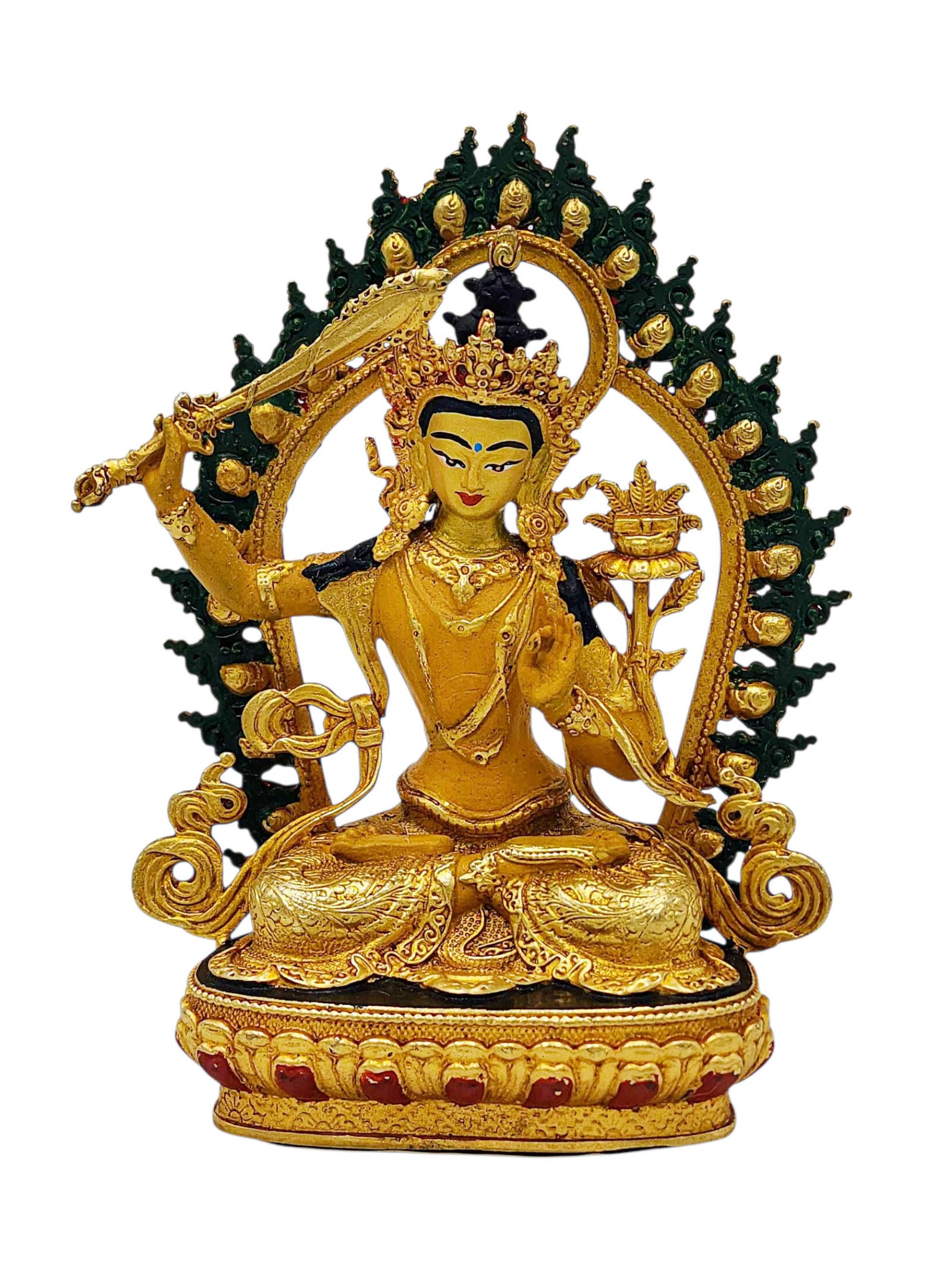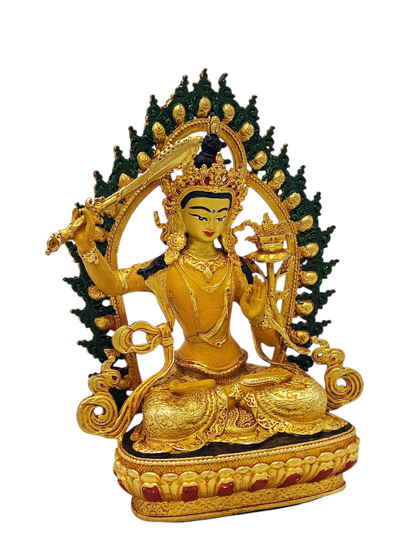 Manjushri, Buddhist Miniature Statue, Partly Gold Plated Finish, Thangka Color Finish, Hand Painted Face , Wisdom Buddha, cutting through ignorance with the sword of insight