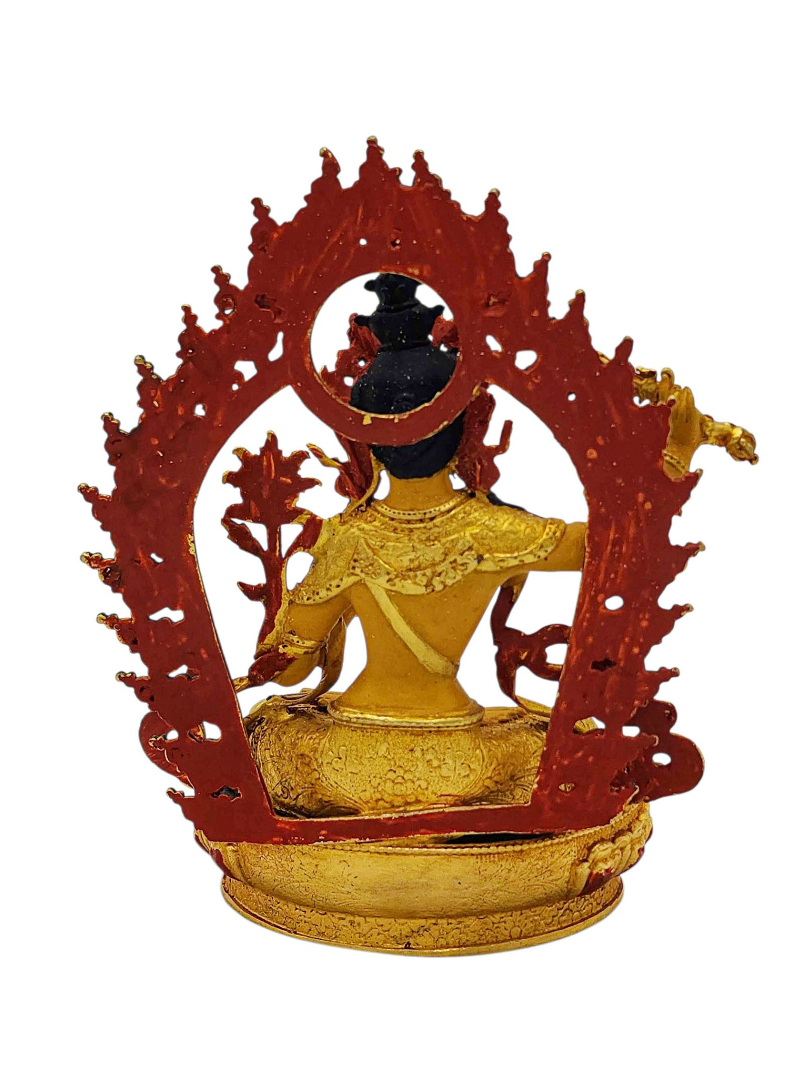 The face of Manjushri is painted with gold to enhance its significant features, particularly the eyes, and lips. This detailed painting is essential as it brings forth the crucial attributes of the expression of eyes and lips that metal carving alone cannot capture.