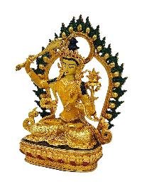 Manjushree is the Bodhisattva who holds the flaming sword [Skt. Khadga] of enlightenment, by his left hand in a warning( Tarjani) hand gesture ( Mudra) in his left hand representing his realization of wisdom to cut through ignorance & wrong view. His right hand depicted in teaching (Jnana Mudra) holds the stem of a Blue Lotus (Utpala) flower upon which rests the Book (Pustaka) of Perfection of Transcendental Wisdom. The blue lotus is a symbol of the victory of the spirit over the senses and signifies the wisdom of knowledge. This represents the lotus that he obtained from the middle of the lake in the Kathmandu Valley out of which grew a lotus bearing a Blue Flame which represents wisdom. Manjushree sits upon a moon disc upon a lotus with an elongated stem arising from a lake. He wears a gold diadem fitted with precious jewels. He wears a silk scarf fastened at the waist and over this, a softly glowing green scarf decorated with golden motifs. His head is silhouetted against a nimbus. The lotus he is sitting on has an elongated stem and arises from a lake representing his recovery of the blue flame of transcendent wisdom and the teaching he originated. The white sash is the attire of the Vajrayana school of Buddhism.