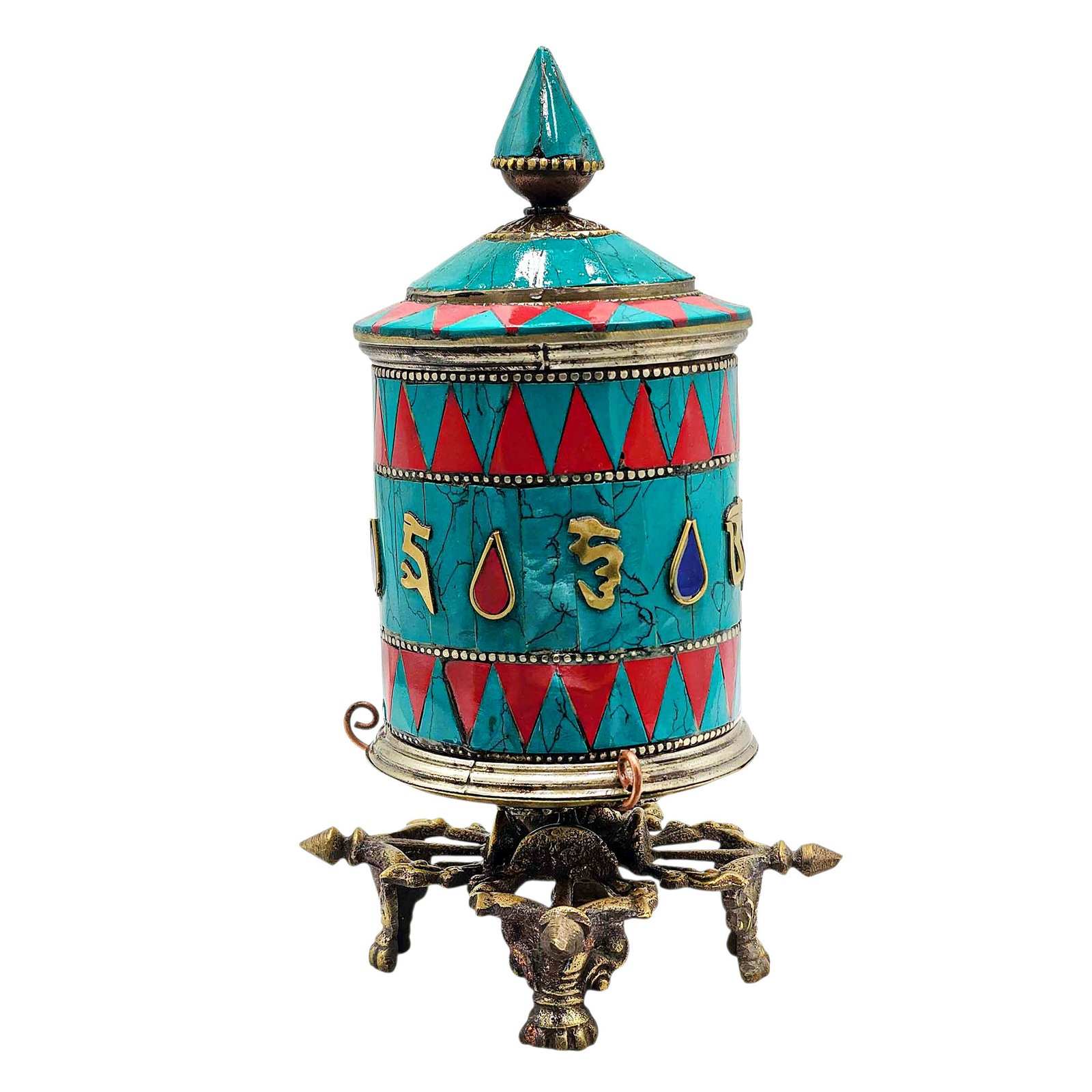 A prayer wheel is a cylindrical wheel on a spindle made from metal, wood, stone, leather, or coarse cotton. Traditionally, the mantra Om Mani Padme Hum is written in the Newari language of Nepal, on the outside of the wheel. Also sometimes depicted are Dakinis, Protectors, and very often the 8 auspicious symbols Ashtamangala. At the core of the cylinder is a "Life Tree" often made of wood or metal with certain mantras written on or wrapped around it. Many thousands (or in the case of larger prayer wheels, millions) of mantras are then wrapped around this life tree. The Mantra Om Mani Padme Hum is most commonly used, but other mantras may be used as well. According to the Tibetan Buddhist tradition based on the lineage texts regarding prayer wheels, spinning such a wheel will have much the same meritorious effect as orally reciting the prayers. Read More