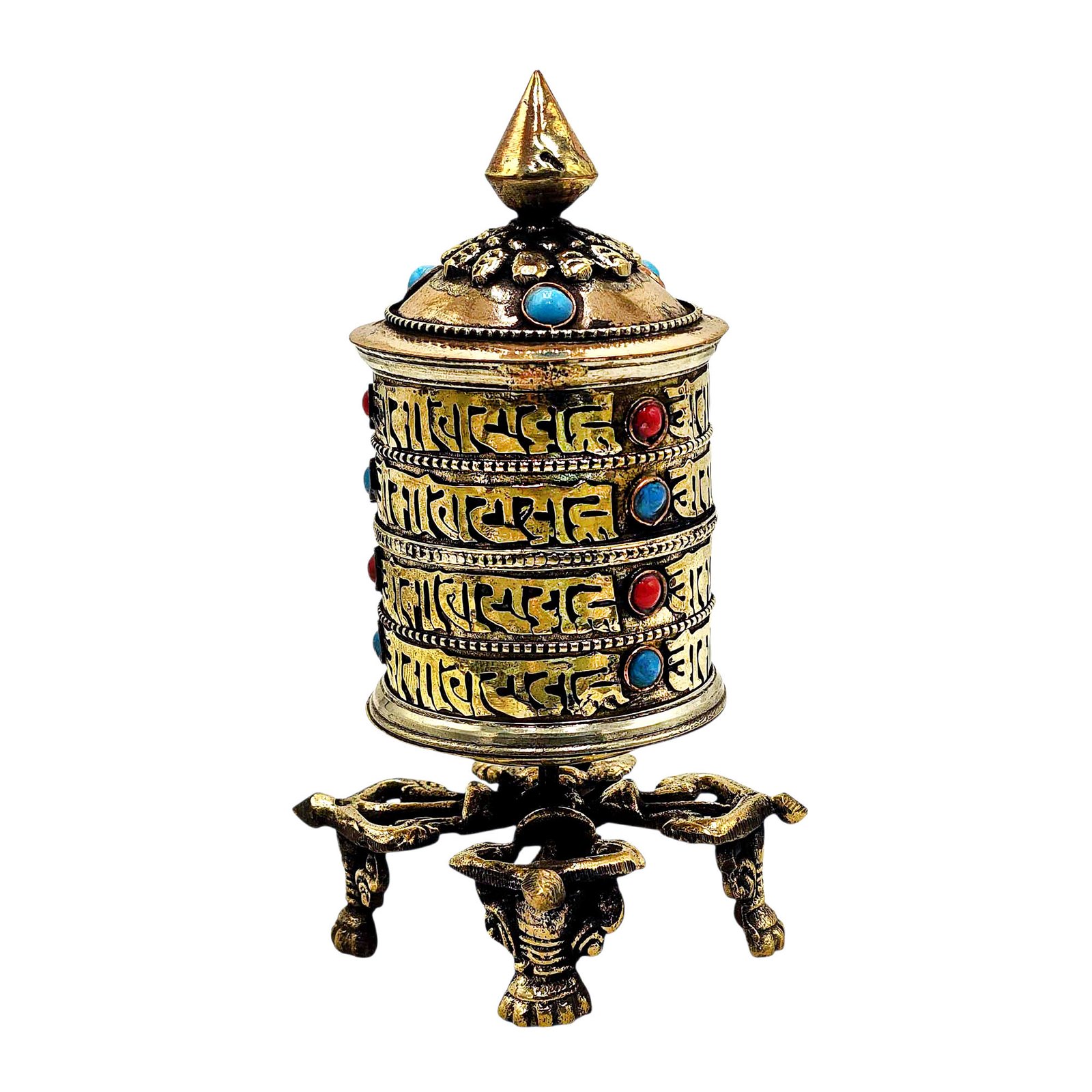 Symbolism and Spiritual Significance: In Tibetan Buddhism, prayer wheels are considered sacred objects that contain written mantras or prayers. Rotating a prayer wheel is believed to accumulate merit and blessings, benefiting both the practitioner and all sentient beings. The prayer wheel stand reinforces the importance of this spiritual practice.