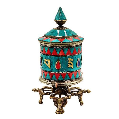 The Prayer wheel Stand is adorned with an exquisite array of semi-precious stones, including turquoise, coral, and lapis lazuli. These stones are carefully selected and meticulously placed on the Prayer wheel Stand's surface, adding a touch of opulence and enhancing its overall beauty. Each stone is thoughtfully positioned using a high-quality adhesive, ensuring secure and long-lasting attachment. The vibrant colors and unique patterns of the stones create a captivating contrast against the backdrop of the Prayer wheel Stand, elevating its visual appeal and making it truly eye-catching. Read More