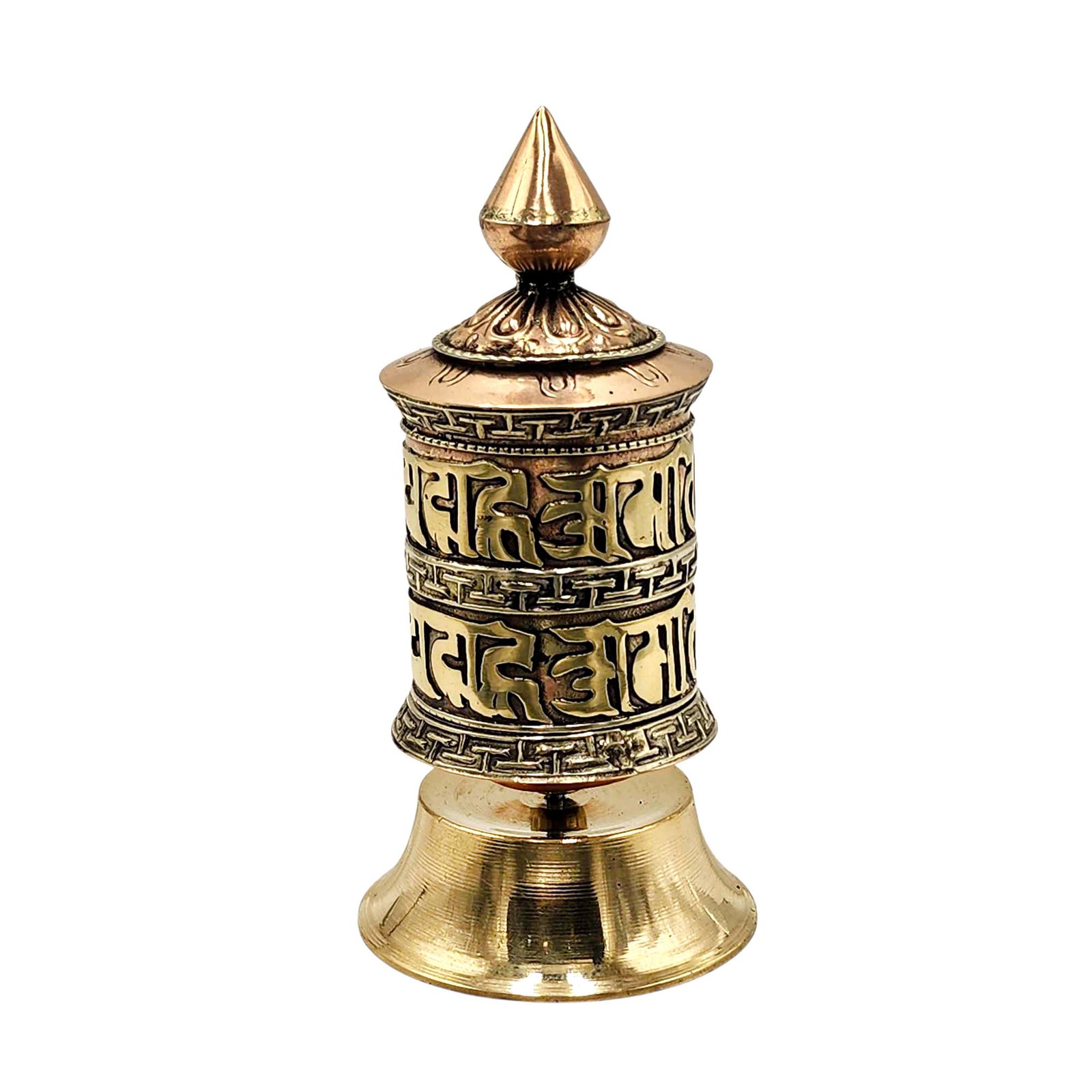 Functionality: The primary function of a prayer wheel stand is to provide a stable base for the prayer wheel, ensuring it remains upright and steady during use. The stand allows the prayer wheel to rotate freely when spun by hand or by the force of wind.