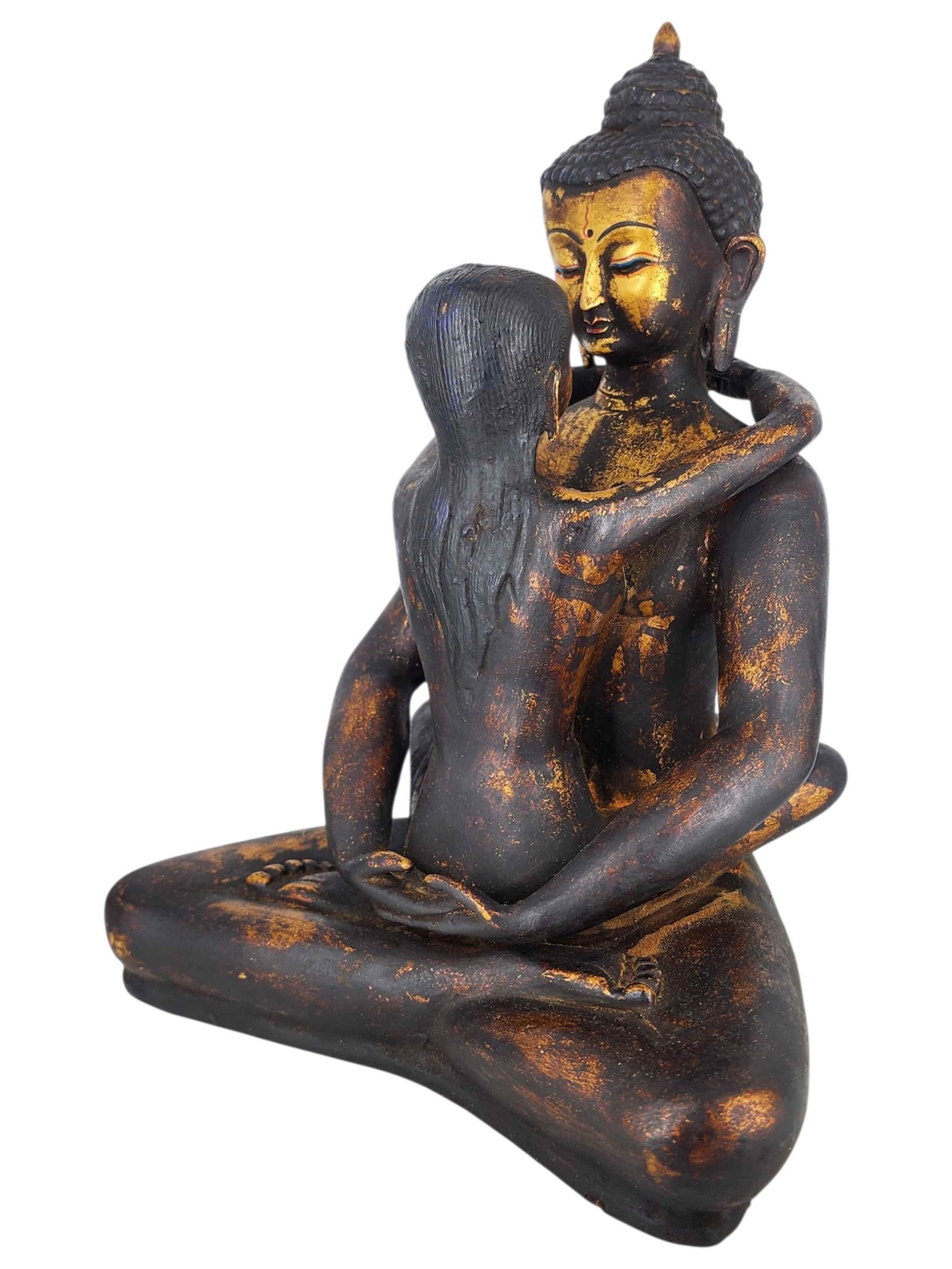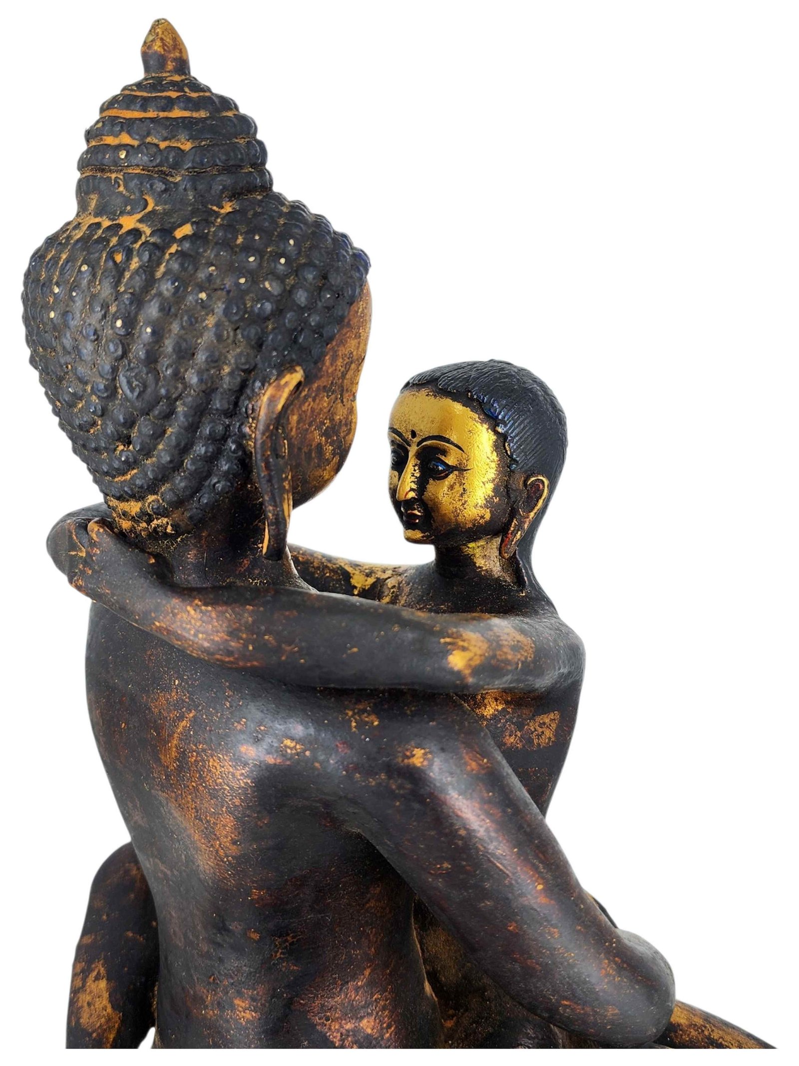 Samantabhadra also known as Visvabhadra, is naked called 'sky clad' , presented embracing figures the white female figure is called Samantabhadri in an body position [Skt. Asana] called Yib-Yum togetherness known as the body of blissful union called Sambhogakaya. The word Samantabhadra means Universal loving Virtue. A union of the inner and outer world. The principle of duality is visualized in male & female, dark-light, love-hate, day & night. The co-emergence [Skt. Sahaja] of wisdom [Skt. Prajna] with fitness of action [Skt. Upaya] which is similar to compassion leads one to a state of Great Bliss [Skt. Mahasukha]. The state of Great Bliss is akin to individual Nirvana.The eight embedded jewels represent the Eightfold Path realised by Sakyamuni. There is a small mirror [Skt. Aina or Darpana] representing introspection, sight or form together with a jewel offering in the foreground. The two hand symbols [Tib. Ting Sha] represent the sense offering of sound. The rainbow beams arising from the crimson nimbus around the head of Samanta Bhadra represent a mastery of Boddhi Nature & one manifestation of the Sambhogakaya is the Rainbow Body. There is a small mirror [Skt. Aina or Darpana] representing introspection, sight or form together with a jewel offering in the foreground. The two hand symbols [Tib. Ting-Sha] represent the sense offering of sound. The rainbow beams arising from the crimson nimbus around the head of Samanta Bhadra represent a mastery of Boddhi Nature & one manifestation of the Sambhogakaya is the Rainbow Body. The co-emergence [Skt. Sahaja] of wisdom [Skt. Prajna] withfitness of action [Skt. Upaya] which is similar to compassion leads one to a state of Great Bliss [Skt. Mahasukha].