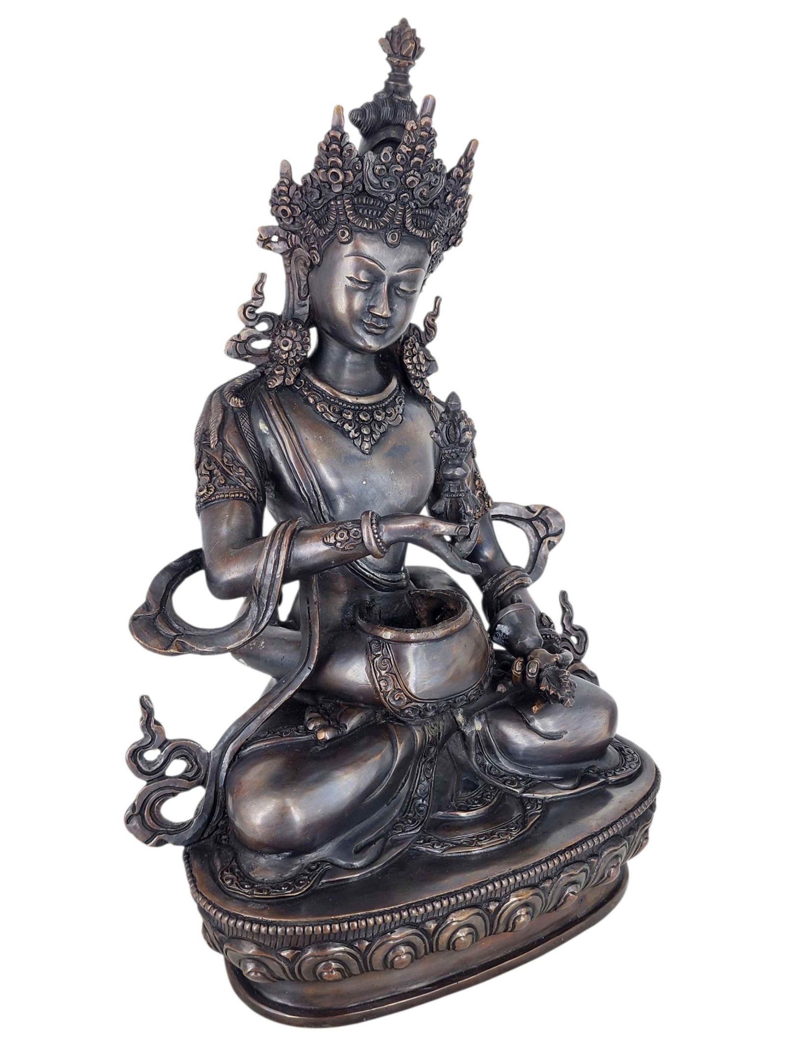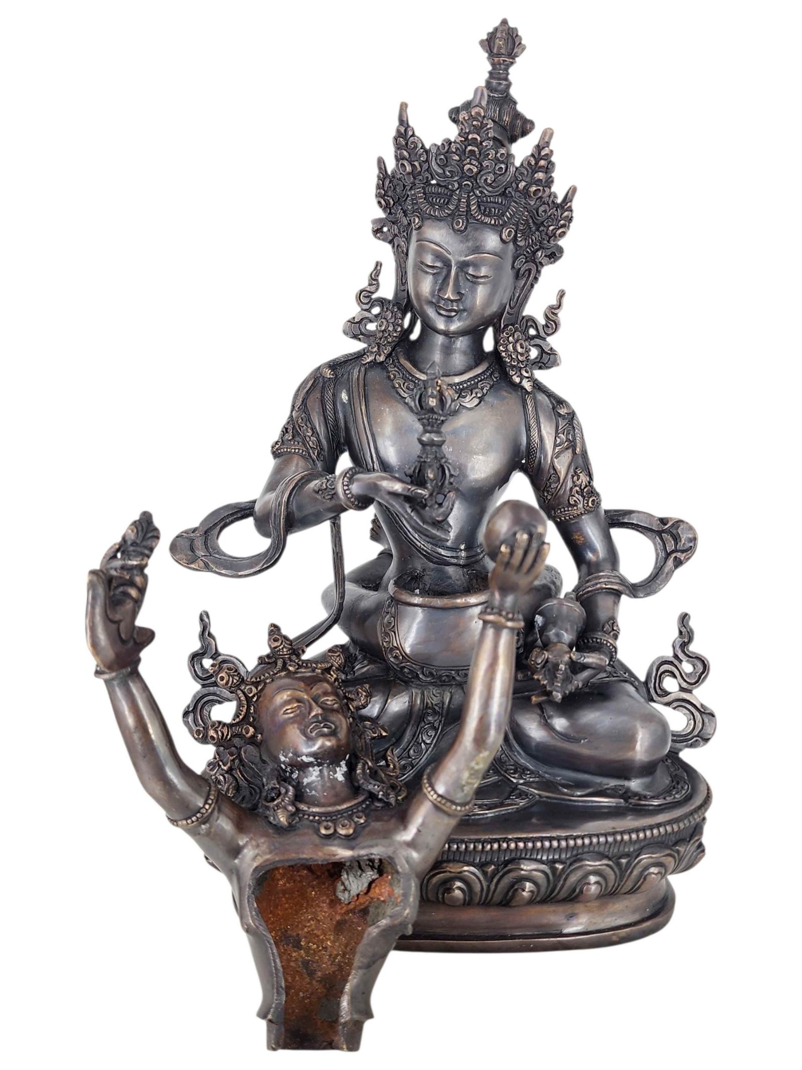 The Vajrasattva features a captivating combination of partly silver plating and dark oxidation. This unique finishing technique combines the lustrous shine of silver with the rich, deep tones achieved through oxidation. In the process of creating this finish, selected areas of the Vajrasattva are expertly silver-plated, creating a radiant and reflective surface that catches the light. The remaining areas are intentionally oxidized, resulting in a darkened patina that adds depth and character to the piece. Read More