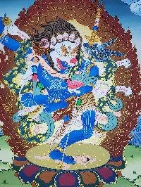 According to Sengdongma (lion-faced dakini) is a wrathful manifestation of Padmasambhava [Guru Rinpoche] who eliminates obstacles, whereas Sinhavaktra is a dark blue Lion-head Dakini who dispels obstacles to enlightenment. She holds a broad-bladed knife and skull cup.