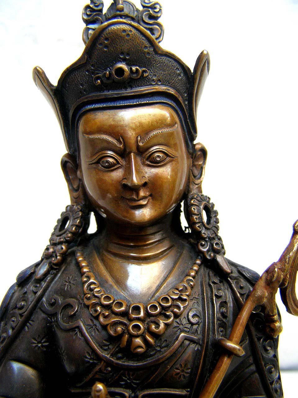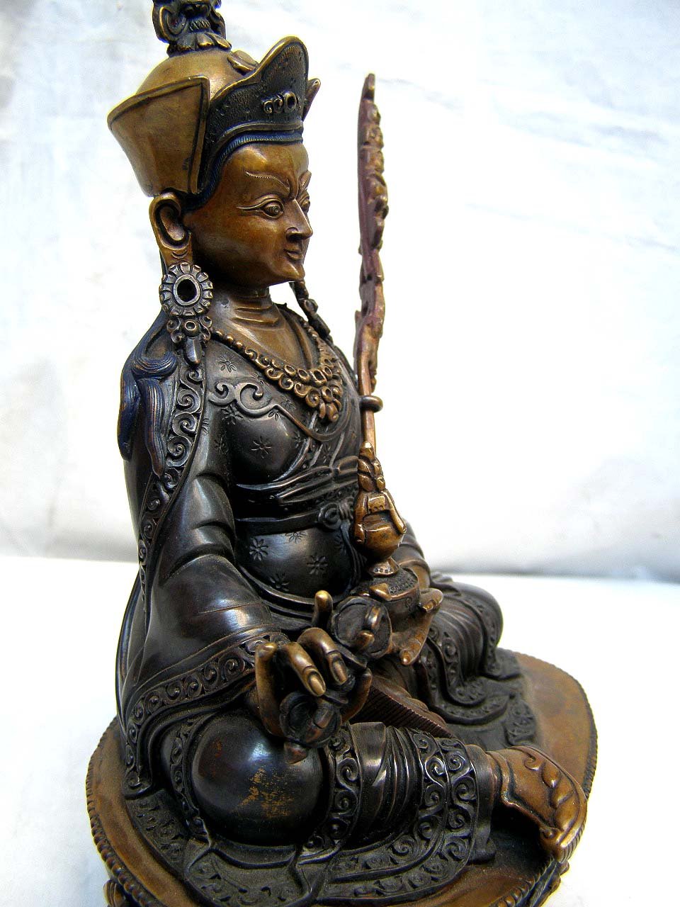 shirt, pants and heavy Tibetan boots, as protection against the cold. He holds the diamond-scepter of compassionate love in his right hand and the yogi's skull-bowl of clear wisdom in his left. He has a special trident called khatvanga of a wandering Yogi, and wears on his head a Nepalese cloth crown, stylistically designed to remind one of the shape of a lotus flower. Thus he is represented as he must have appeared in Tibet.