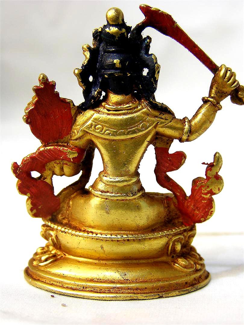 This Manjushri has finished in a full gold Plated antique patina. The Antique finishing imparts a sense of age and character to the Manjushri, enhancing its overall appeal. In the Antique finishing process, after the Gold plating is applied, a carefully applied layer of varnish is added. This varnish not only contributes to the antique look but also serves as a protective barrier, ensuring the longevity of the gold plating. It helps to safeguard the gold layer but also prevents tarnishing for an extended period. Read More