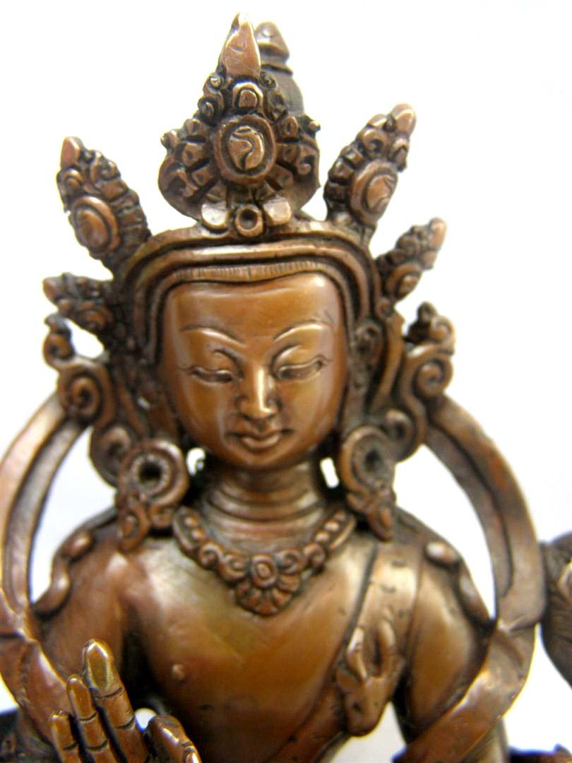 This Simhanada Lokeshvara has been meticulously treated with a chocolate color antique patina. The intention behind this patina is to replicate the appearance of a copper statue that has gracefully aged over a century. Unlike a simple coat of paint, this patina is not applied superficially and is designed to endure. It undergoes an artificial oxidation process that adds depth and character, while also serving as a protective layer against natural oxidation.