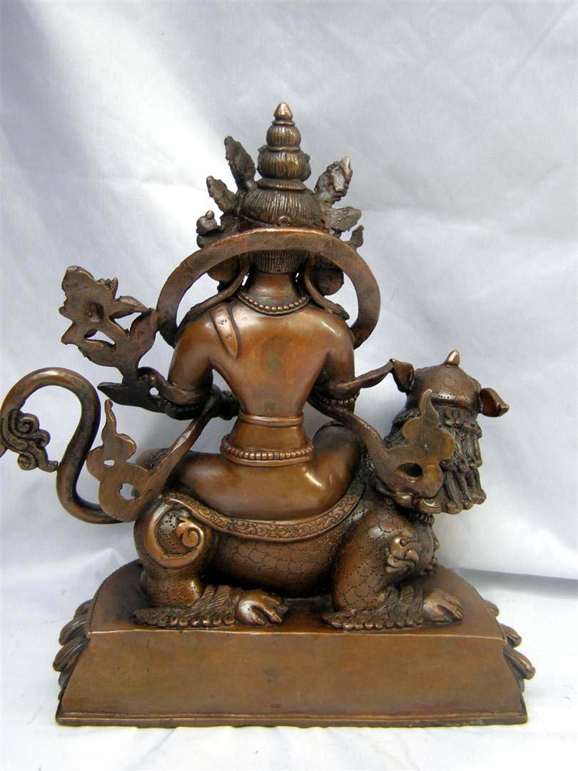 By imitating the natural aging process, the chocolate color antique patina lends an air of authenticity and vintage charm to the Simhanada Lokeshvara. This carefully crafted finish ensures that the patina remains intact for an extended period, offering longevity and resistance to wear. The result is a unique piece that captures the essence of a time-worn copper statue, evoking a sense of history and artistic heritage.