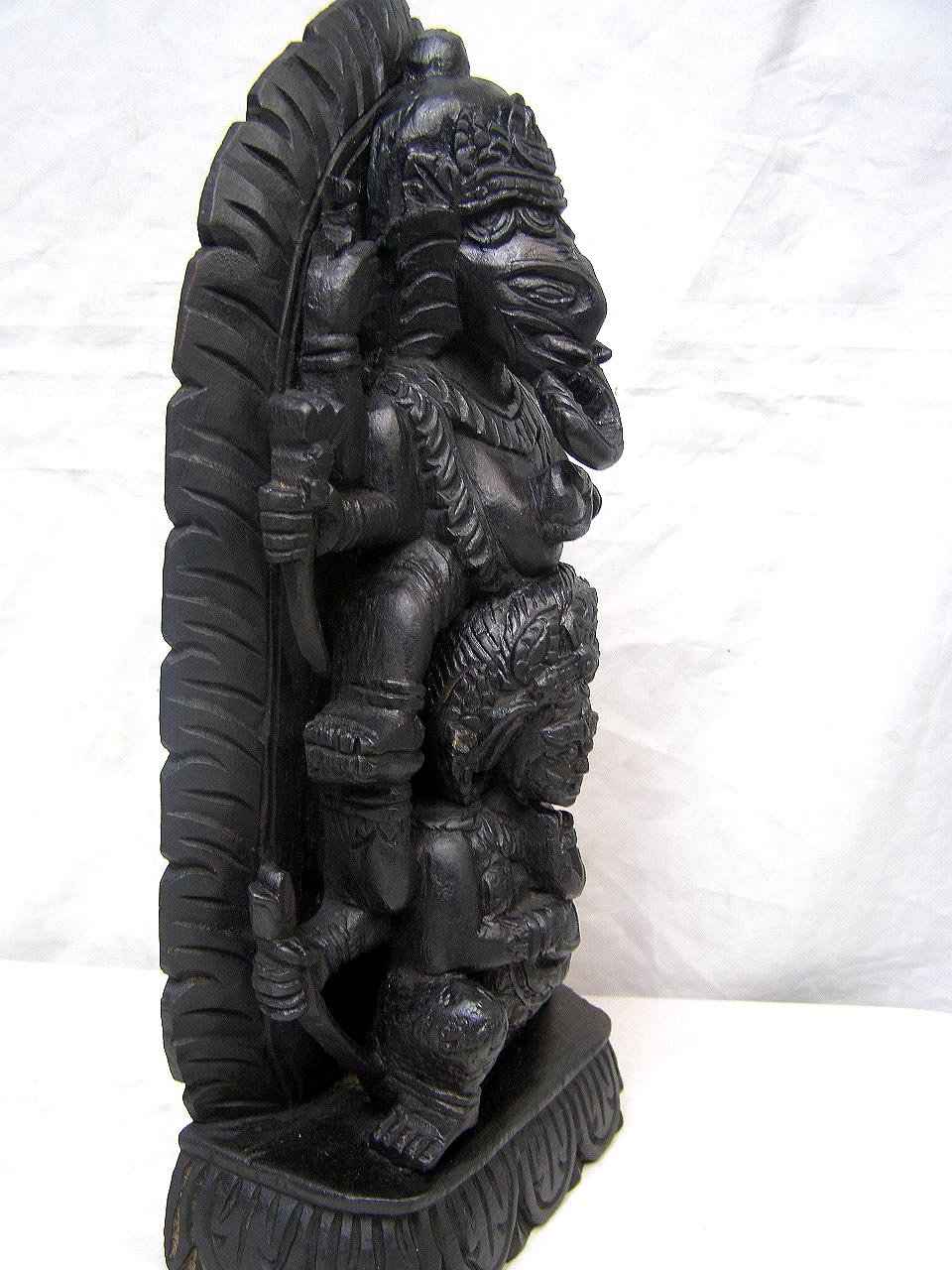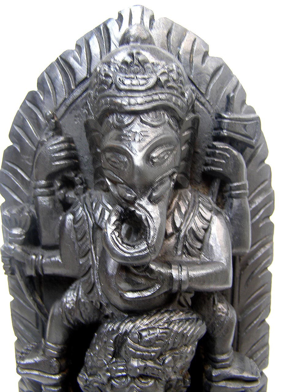 Ganesha has the head of an elephant and a big belly. This statue has four arms, which is common in depictions of Ganesha. He holds his own broken tusk in his lower-right hand and holds a delicacy, which he samples with his trunk, in his lower-left hand. The motif of Ganesha turning his trunk sharply to his left to taste a sweet in his lower-left hand is a particularly archaic feature. A more primitive statue in one of the Ellora Caves with this general form has been dated to the 7th century.[38] Details of the other hands are difficult to make out on the statue shown. In the standard configuration, Ganesha typically holds an axe or a goad in one upper arm and a noose in the other upper arm.