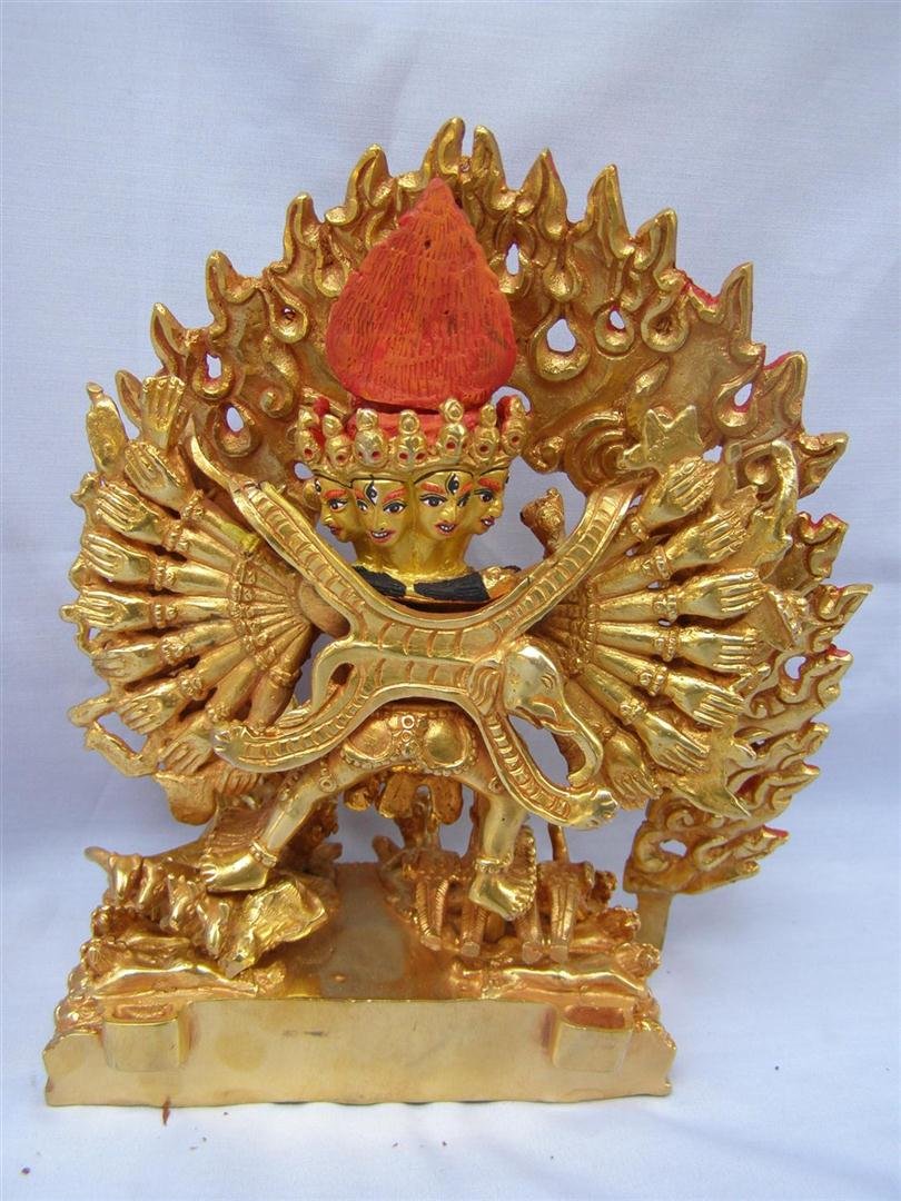 This Yamantaka is finished with full gold plating. also known as mercury gold plating or fire gold plating. This traditional technique involves the application of a genuine layer of gold onto the Yamantaka. Referred to as mercury gold plating, it is considered the correct and authentic form of gold plating in Nepal. Despite being more expensive than electroplating, this traditional mercury gold plating is gaining popularity again in Nepal. People are drawn to its authenticity, longevity, and the unmatched beauty it brings to the Yamantaka. The resurgence of interest in this traditional form of gold plating reflects a growing appreciation for the craftsmanship and cultural heritage of Nepal Read More