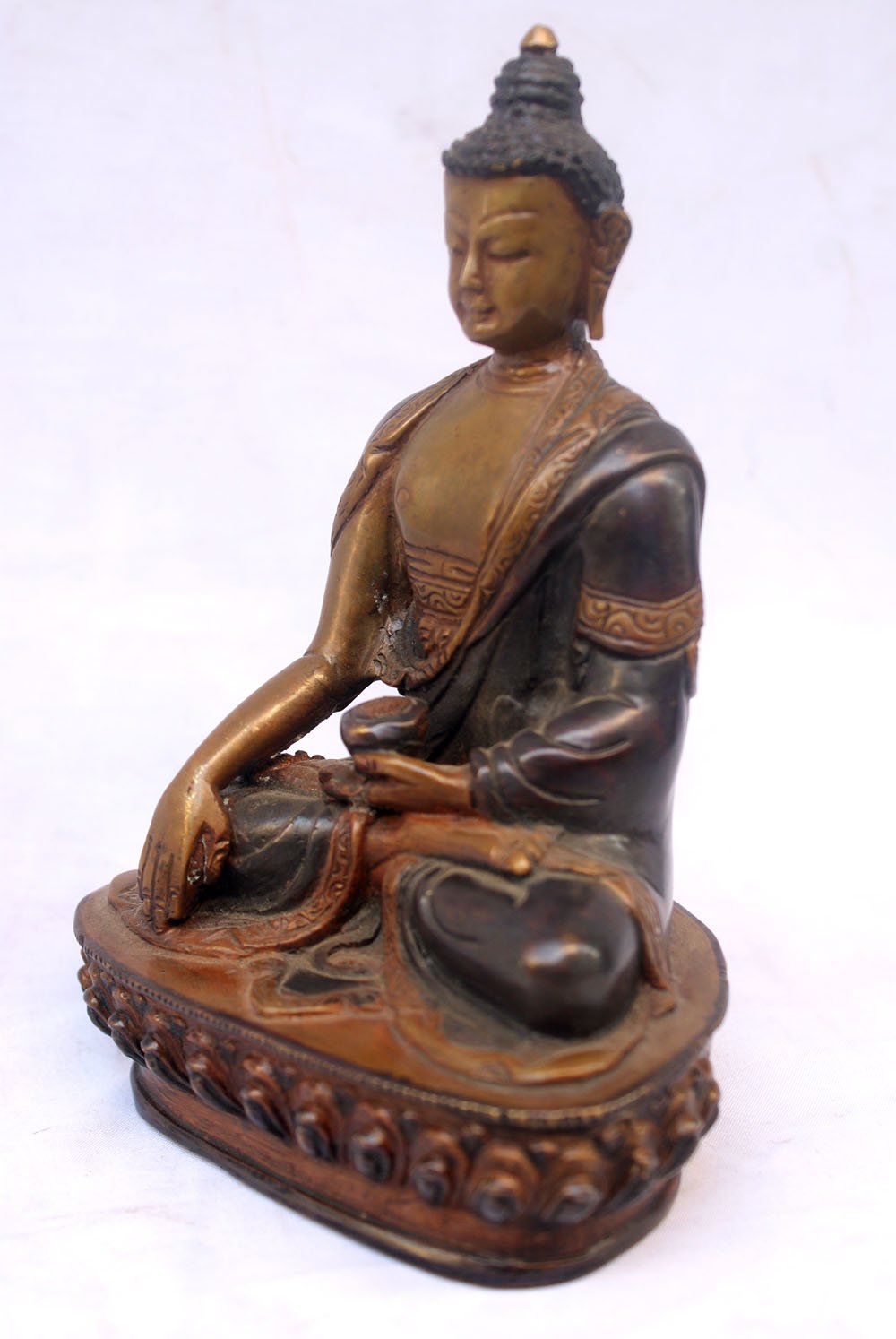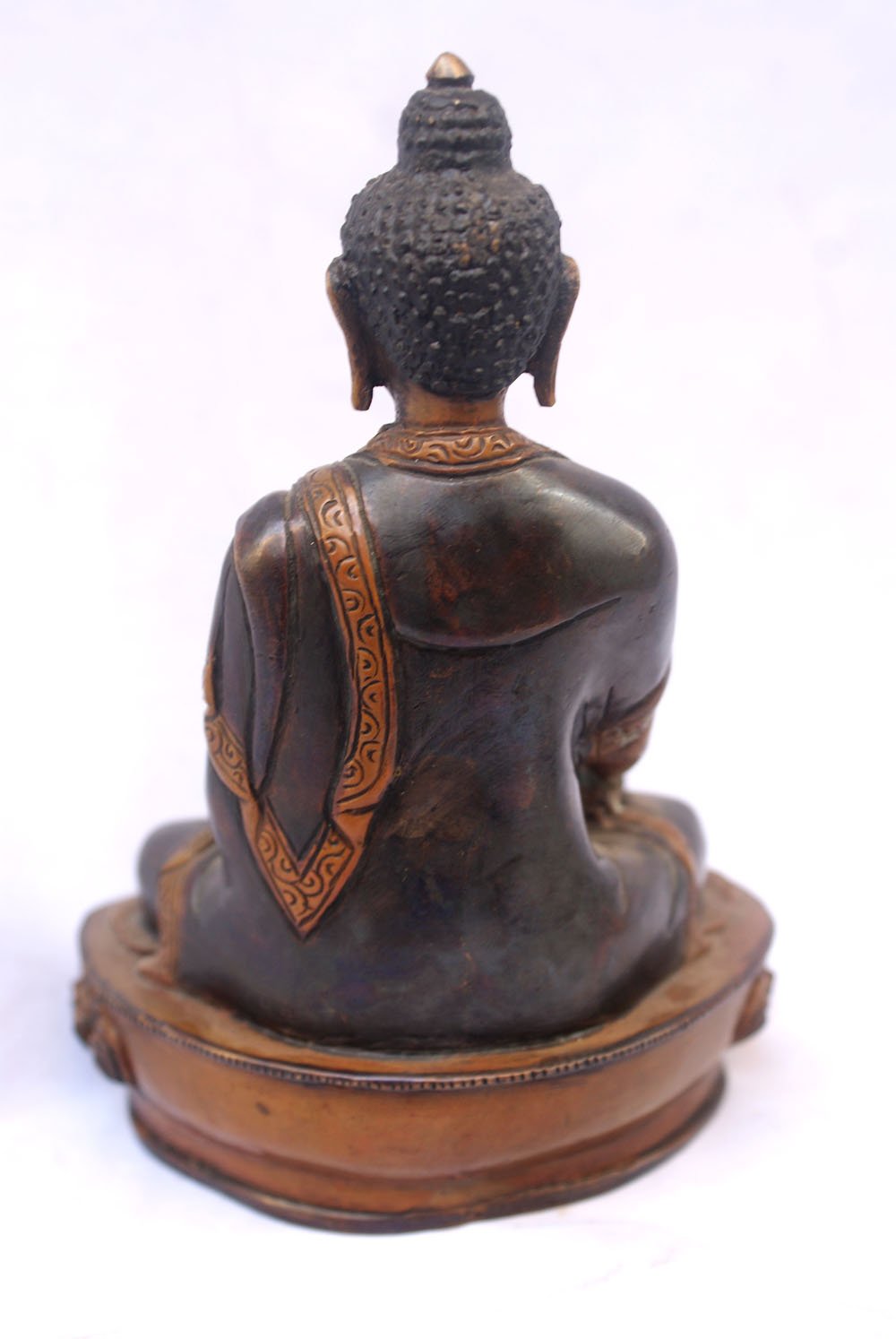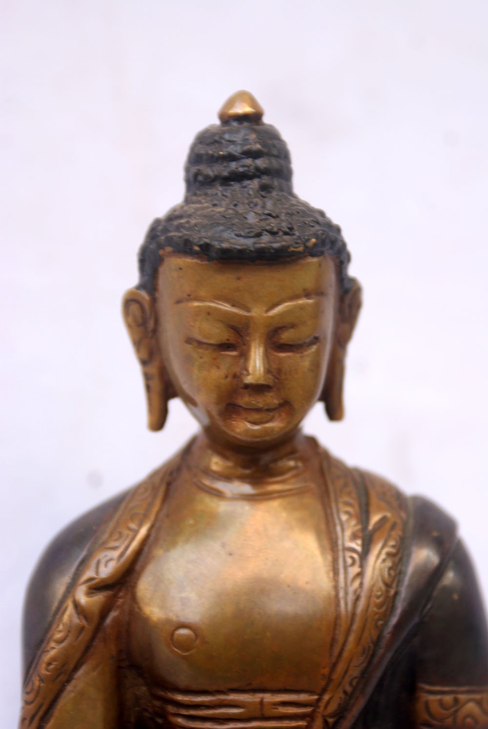 The Shakyamuni Buddha boasts a mesmerizing double-color oxidation finish, featuring a combination of darker and lighter shades of oxidation. This unique technique adds depth and complexity to the statue's appearance, creating a captivating visual effect. Through a meticulous oxidation process, certain areas of the Shakyamuni Buddha are intentionally oxidized to achieve a darker shade, while other areas are oxidized to a lighter tone. This deliberate contrast between the two shades creates a dynamic interplay of colors, enhancing the contours and details of the statue. Read More