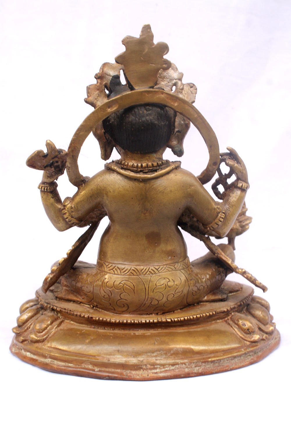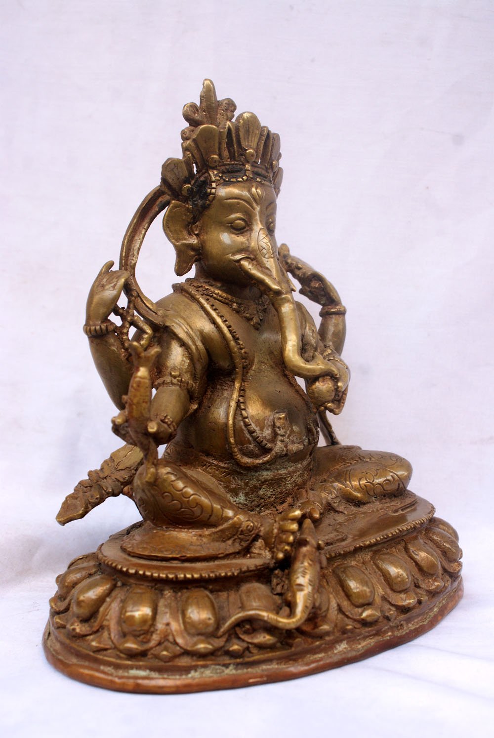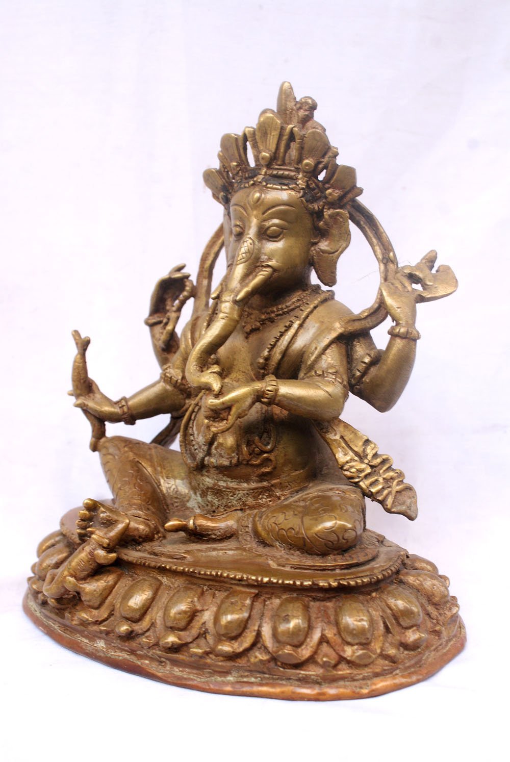 This Ganesh has been meticulously treated with a chocolate color antique patina. The intention behind this patina is to replicate the appearance of a copper statue that has gracefully aged over a century. Unlike a simple coat of paint, this patina is not applied superficially and is designed to endure. It undergoes an artificial oxidation process that adds depth and character, while also serving as a protective layer against natural oxidation.