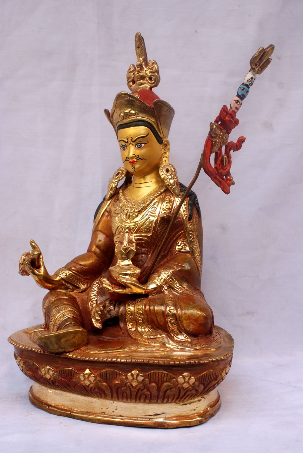shirt, pants and heavy Tibetan boots, as protection against the cold. He holds the diamond-scepter of compassionate love in his right hand and the yogi's skull-bowl of clear wisdom in his left. He has a special trident called khatvanga of a wandering Yogi, and wears on his head a Nepalese cloth crown, stylistically designed to remind one of the shape of a lotus flower. Thus he is represented as he must have appeared in Tibet.