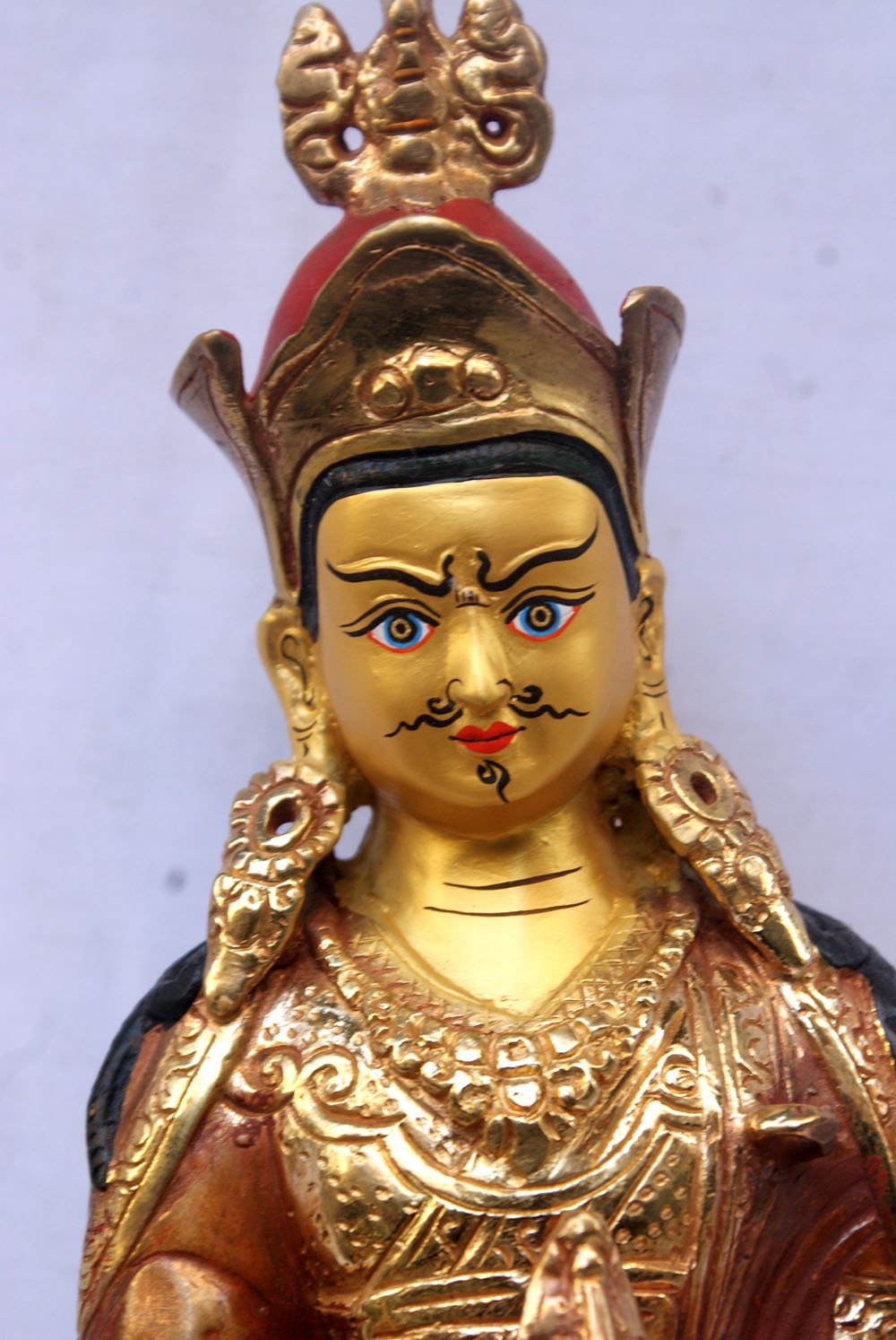 The face of Padmasambhava is painted with gold to enhance its significant features, particularly the eyes, and lips. This detailed painting is essential as it brings forth the crucial attributes of the expression of eyes and lips that metal carving alone cannot capture.