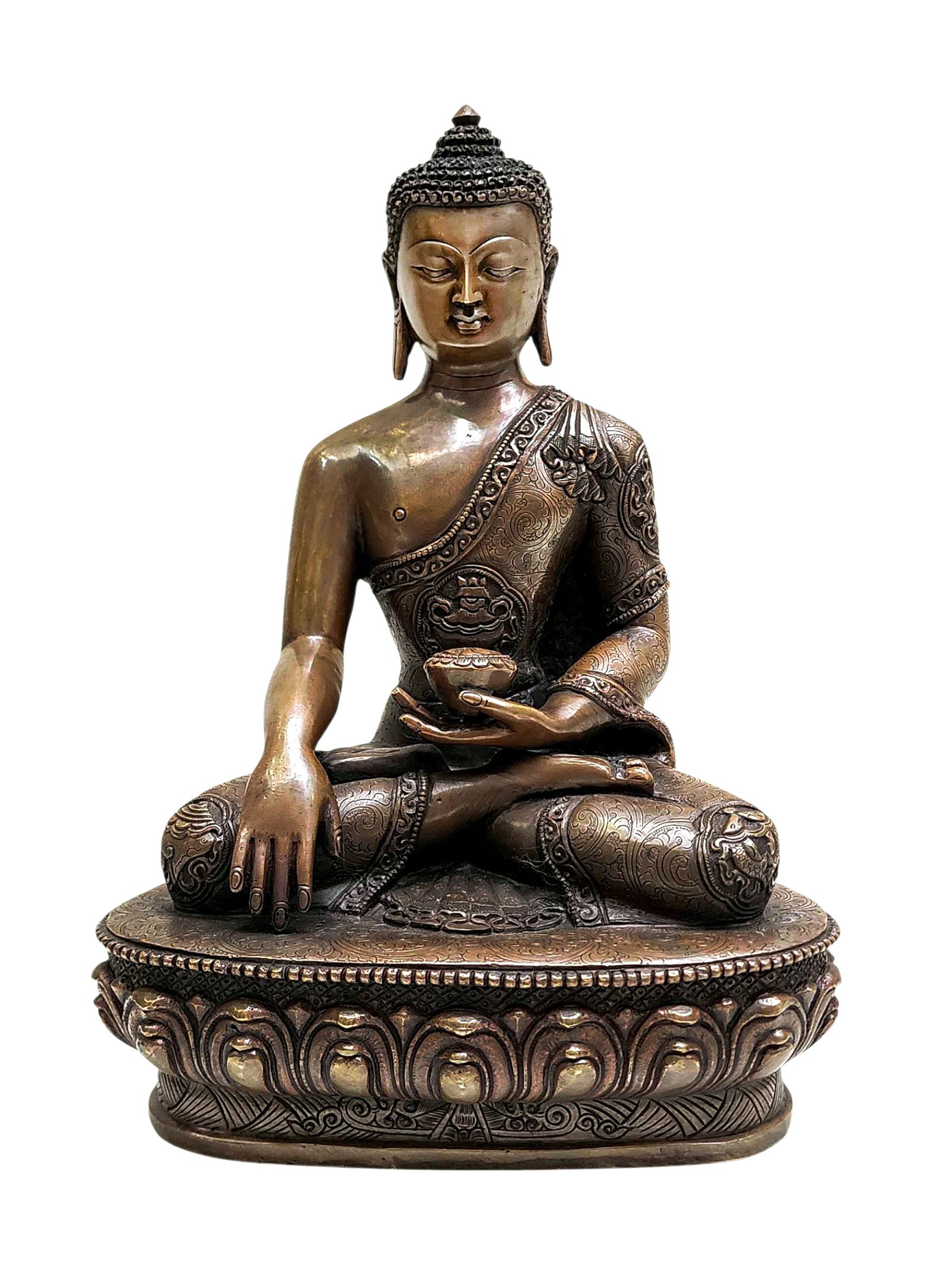 Shakyamuni Buddha, Handmade Statue, Chocolate Color Oxidized, With Asthamangal Carving